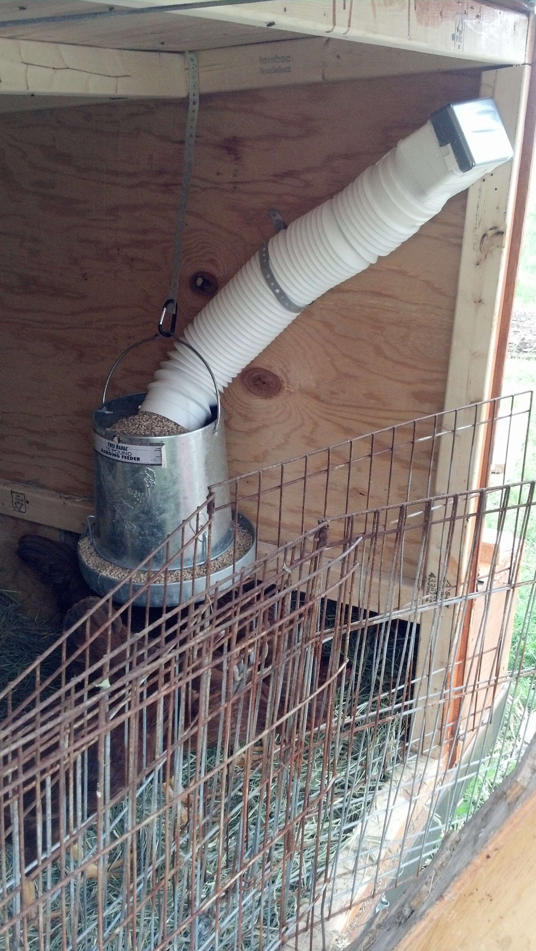 Ray ran a piece of flexible gutter from the top of the door to the feeder. In order to keep the hens’ food out of the way of their laying boxes, Ray hung it from the top of the coop using galvanized plumber’s tape. To fill the feeder, all we will have to do is open the big door and pour feed into the opening of the gutter once a week.