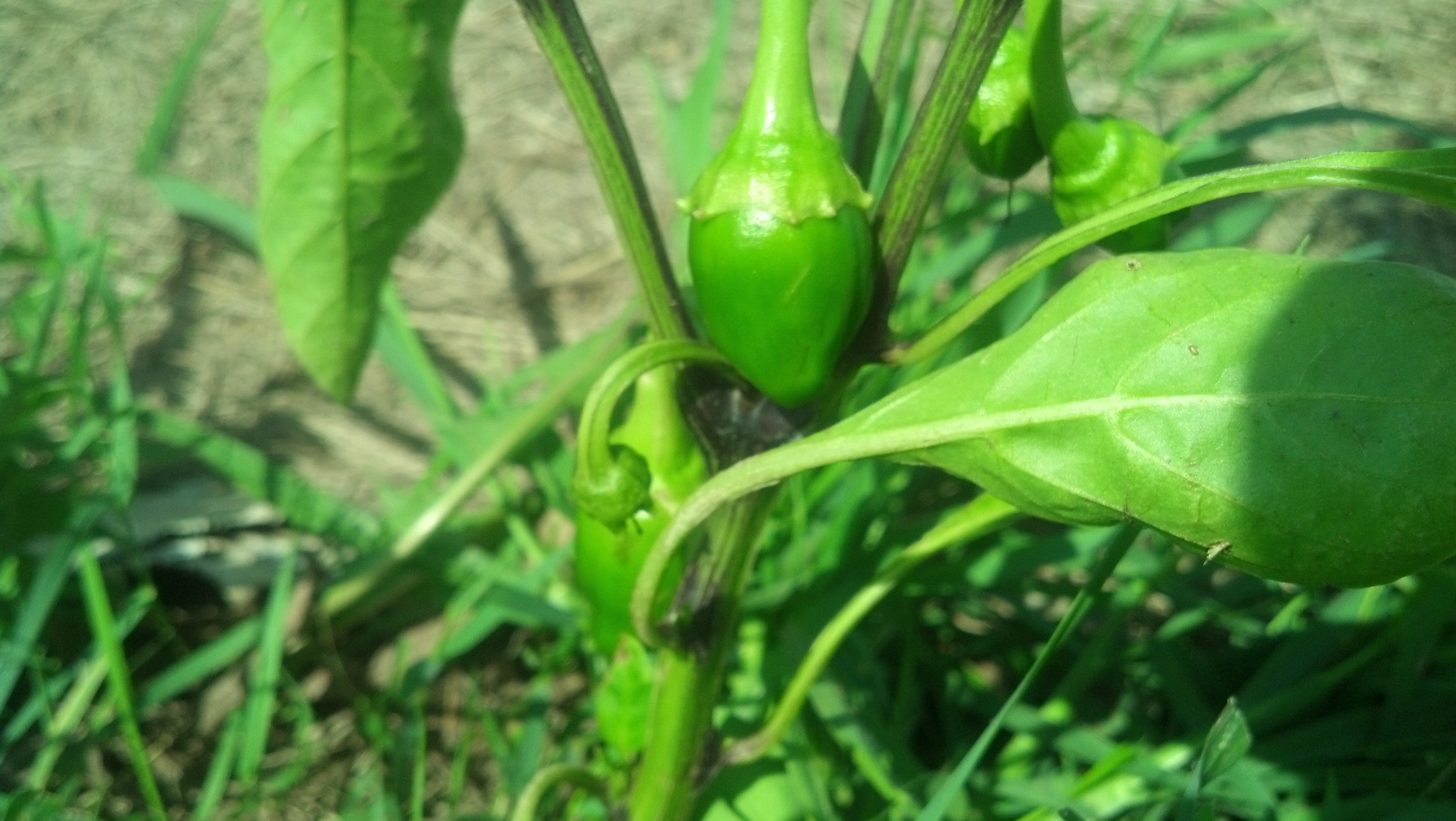 Next, while searching for my arch enemies in the rose/strawberry patch, I found peppers on one of the jalapeno plants. Three peppers are almost ready to pick! Now if the rest would follow suit.
