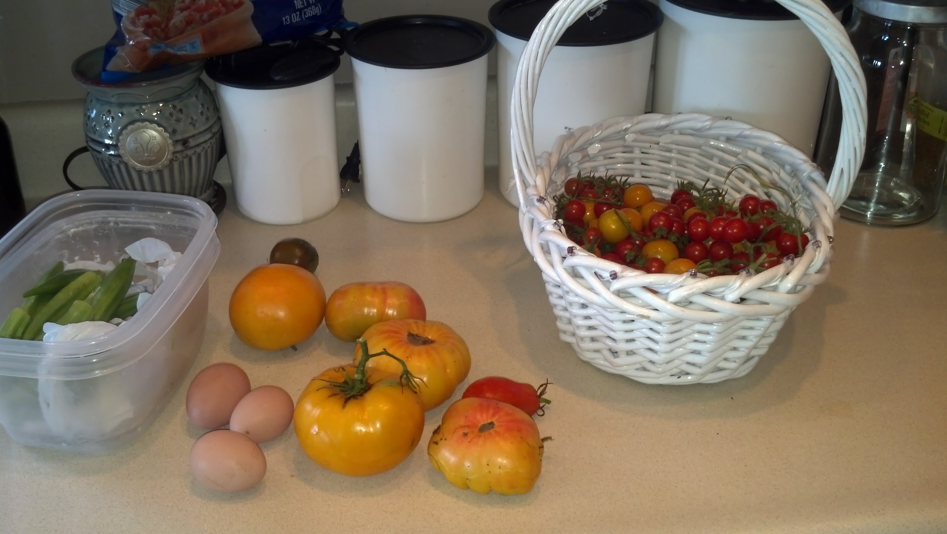 Today’s harvest consisted of a basketful of red and orange cherry tomatoes, several heirlooms and some okra. Later on, the girls picked some more cherry tomatoes, beans and a sprig of dill.