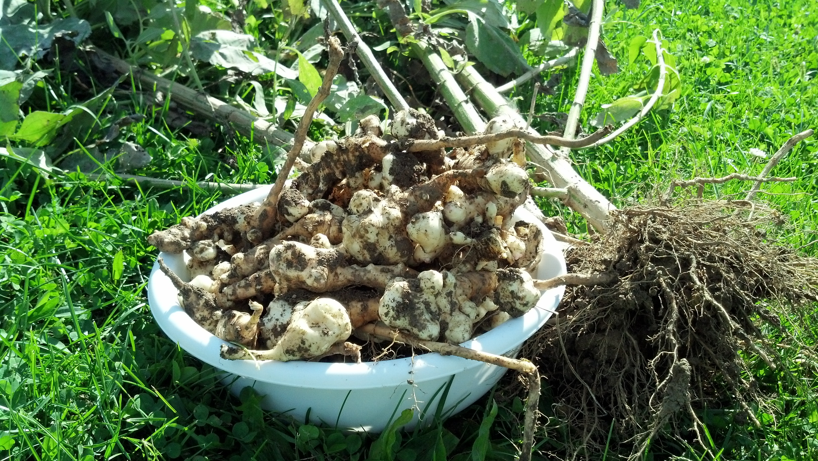 Today, I noticed that the Jerusalem artichokes were almost lying on the ground. One was even pulling out by the root, so I decided it was time to start harvesting.