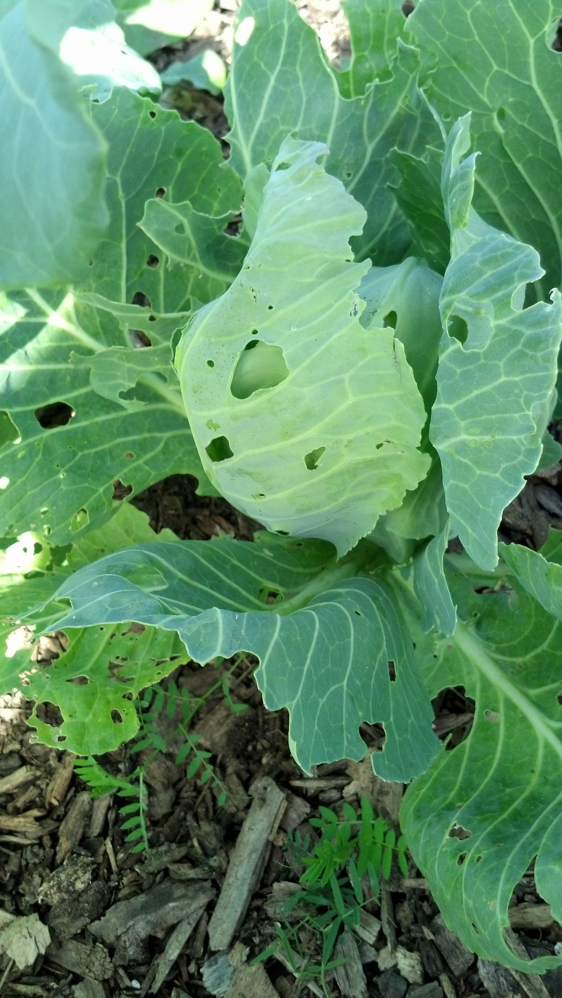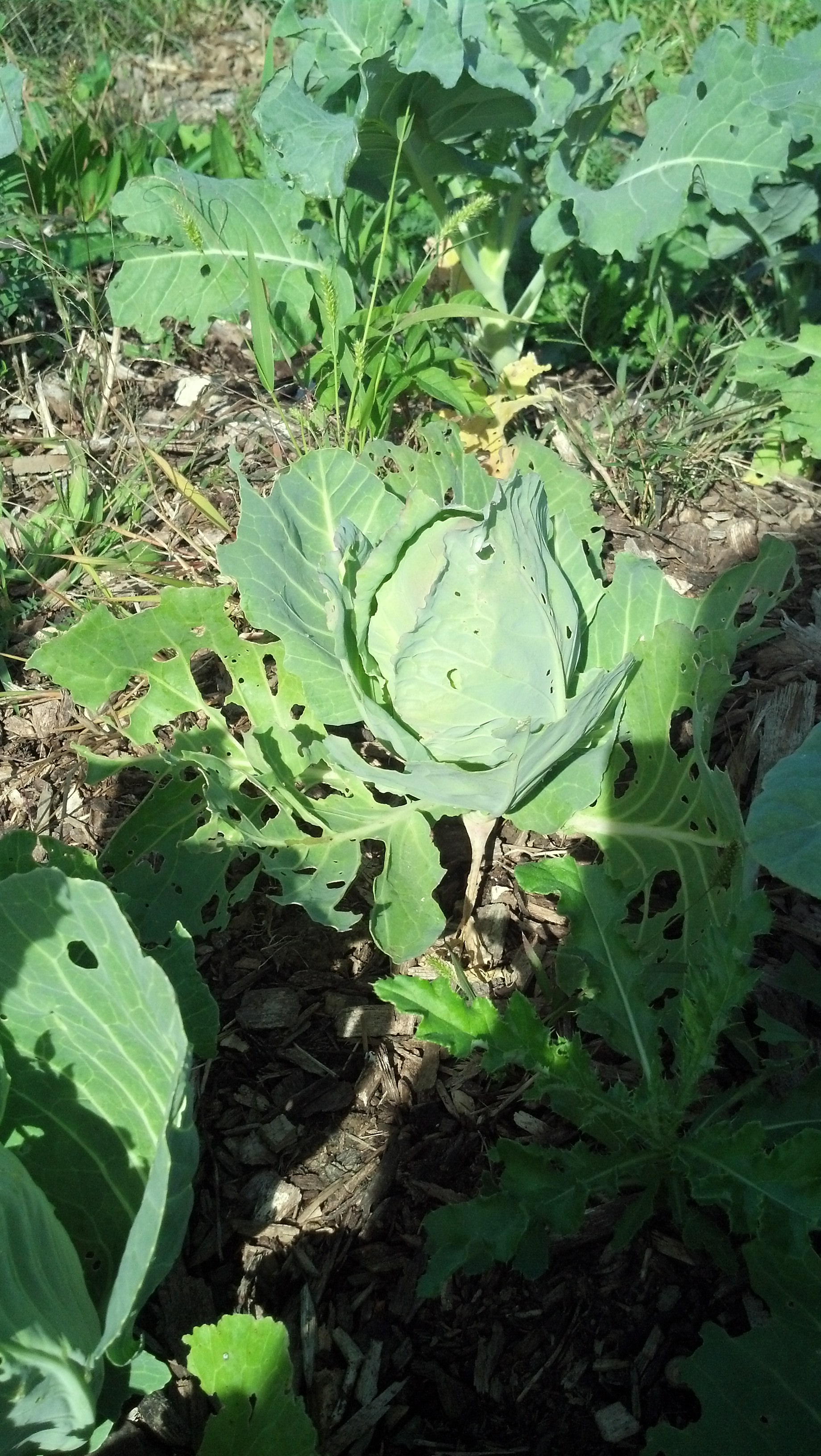 The cabbage patch is bursting with life! The heads of cabbage and brussel sprouts are looking good even with all the insect bites. Besides, I planted enough to share.