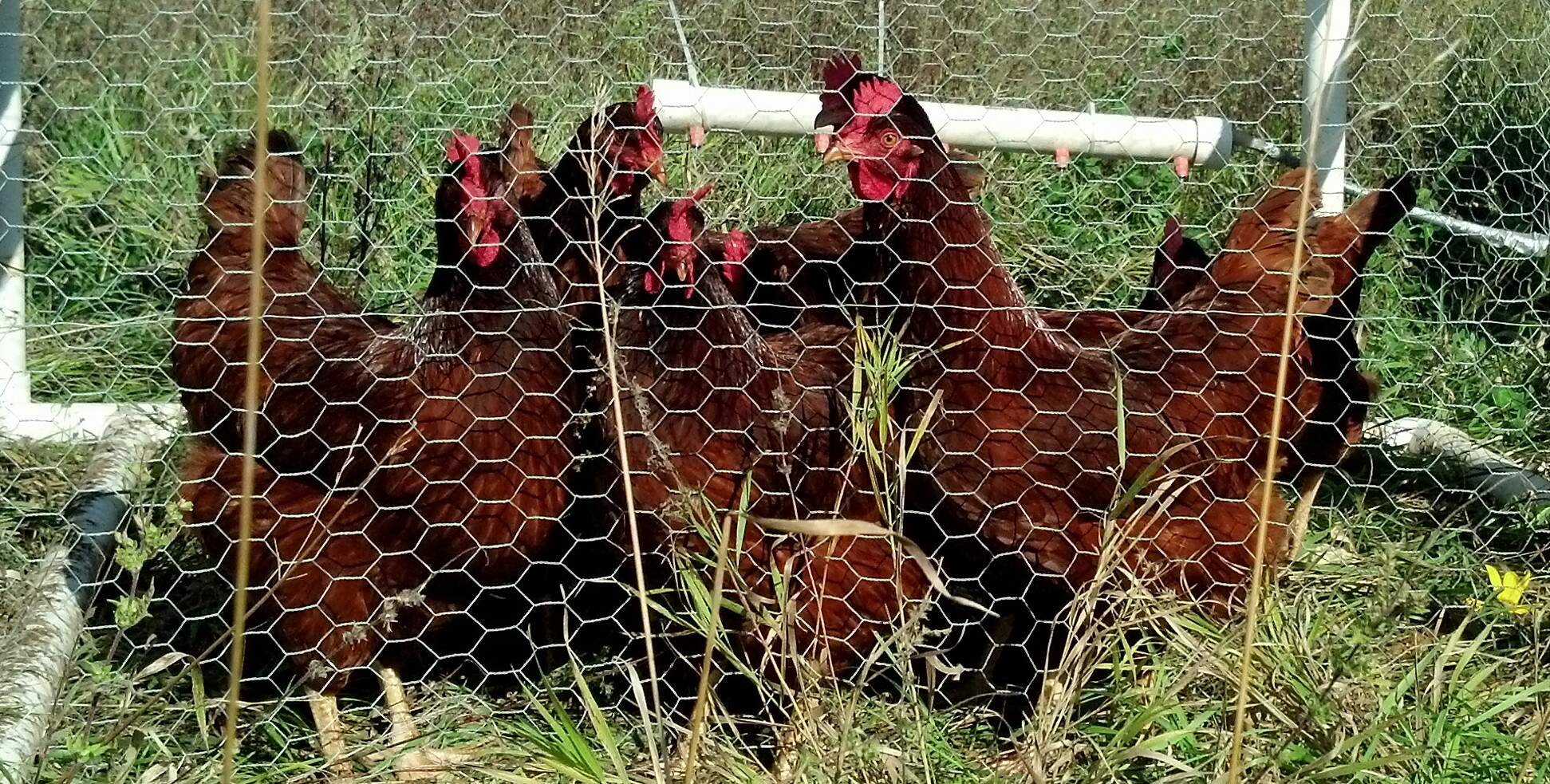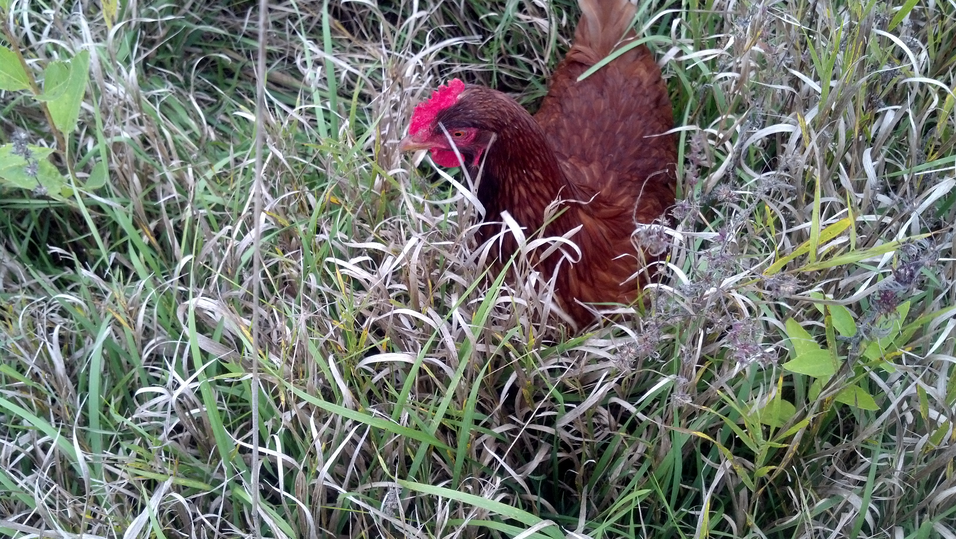 They both started to walk the property, looking for the missing hen. Lissa saw a flash of red out in the pasture.