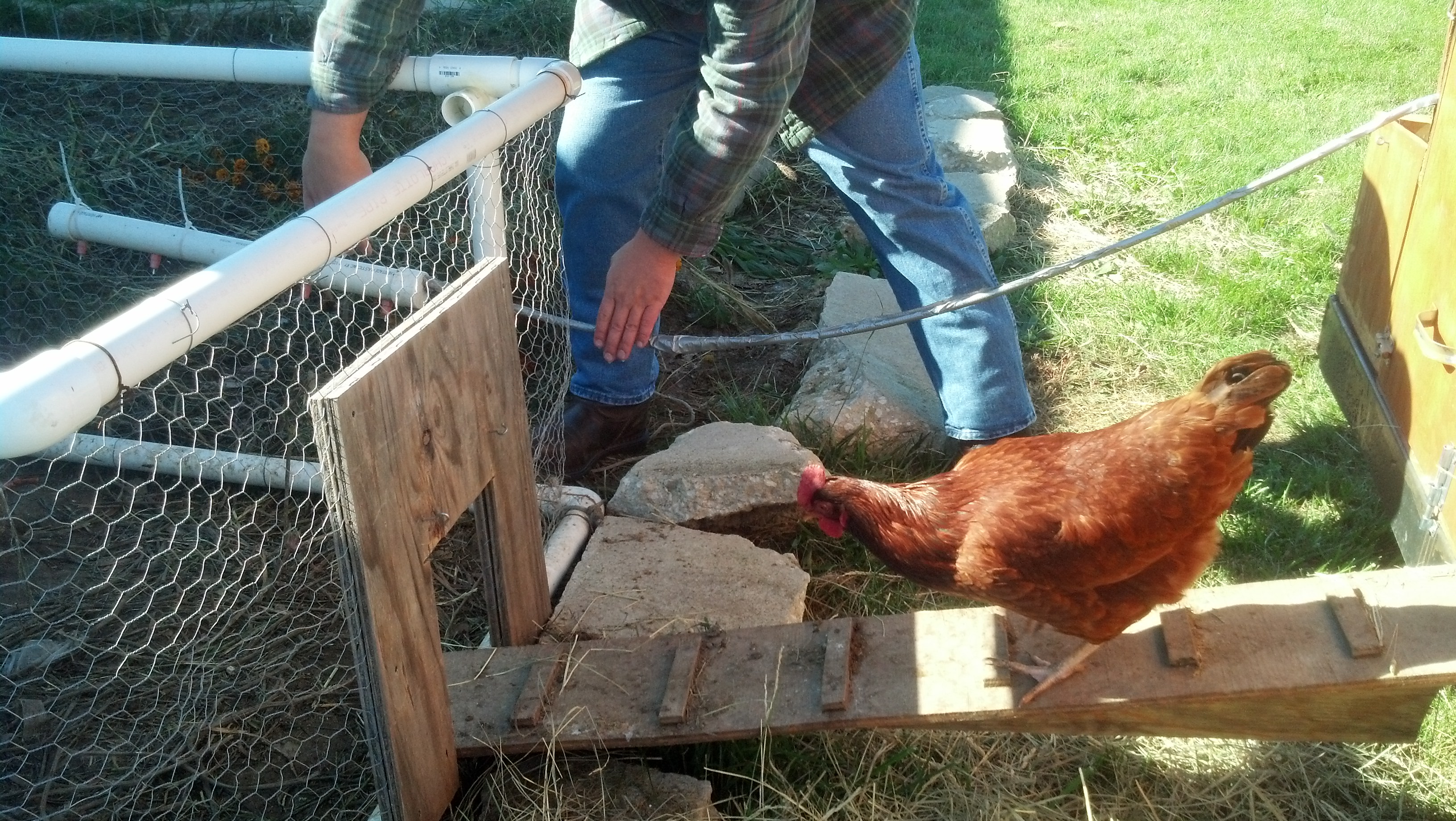 At last the coop was moved, the heated waterer plugged in and the chickens safely back in their home.