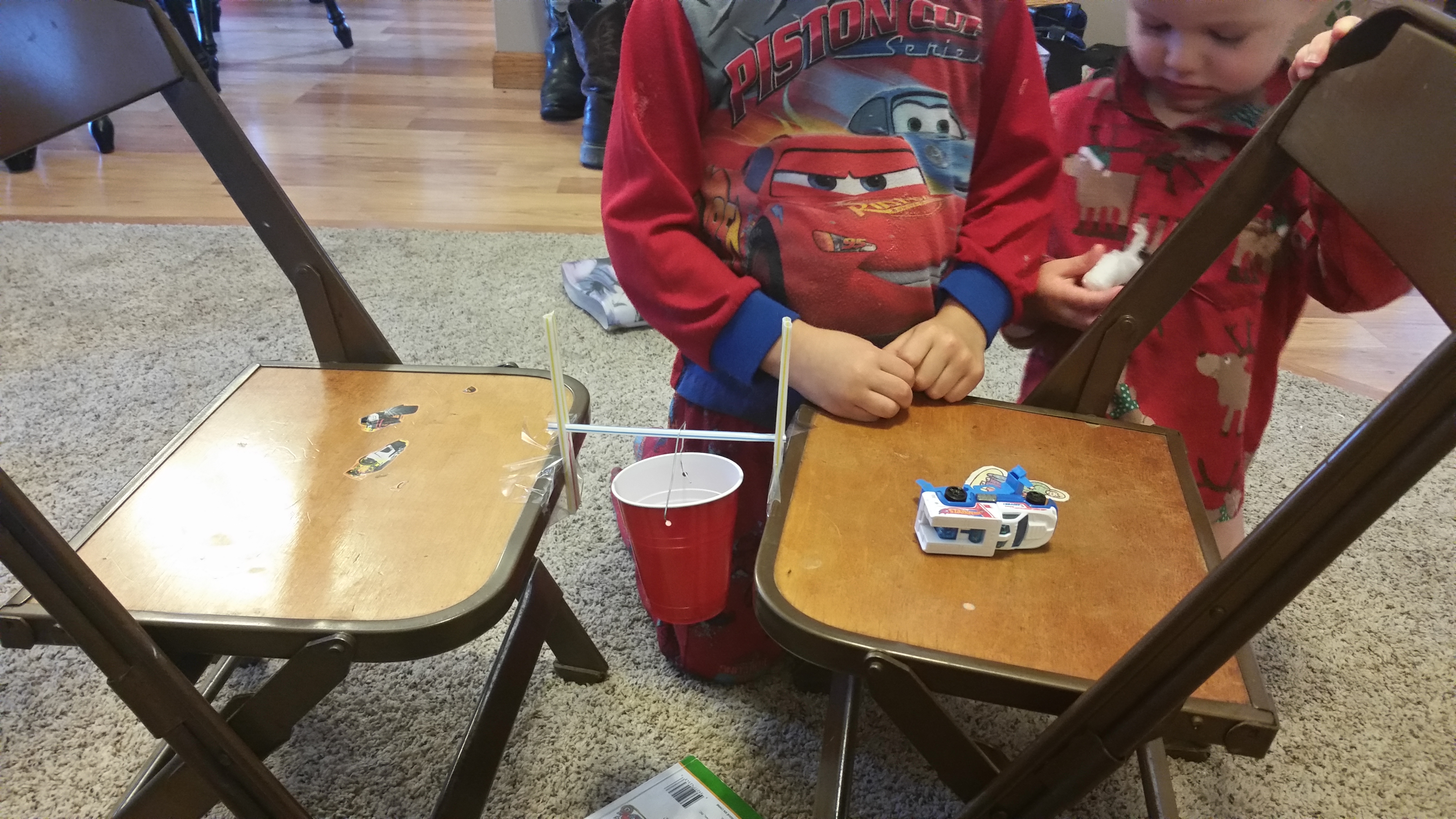 Joe and Jake looked around the house for different things to drop into the cup: a quarter, a cotton ball, toy cars, etc. We started with the lightest item and worked up by weight until the bridge gave out.