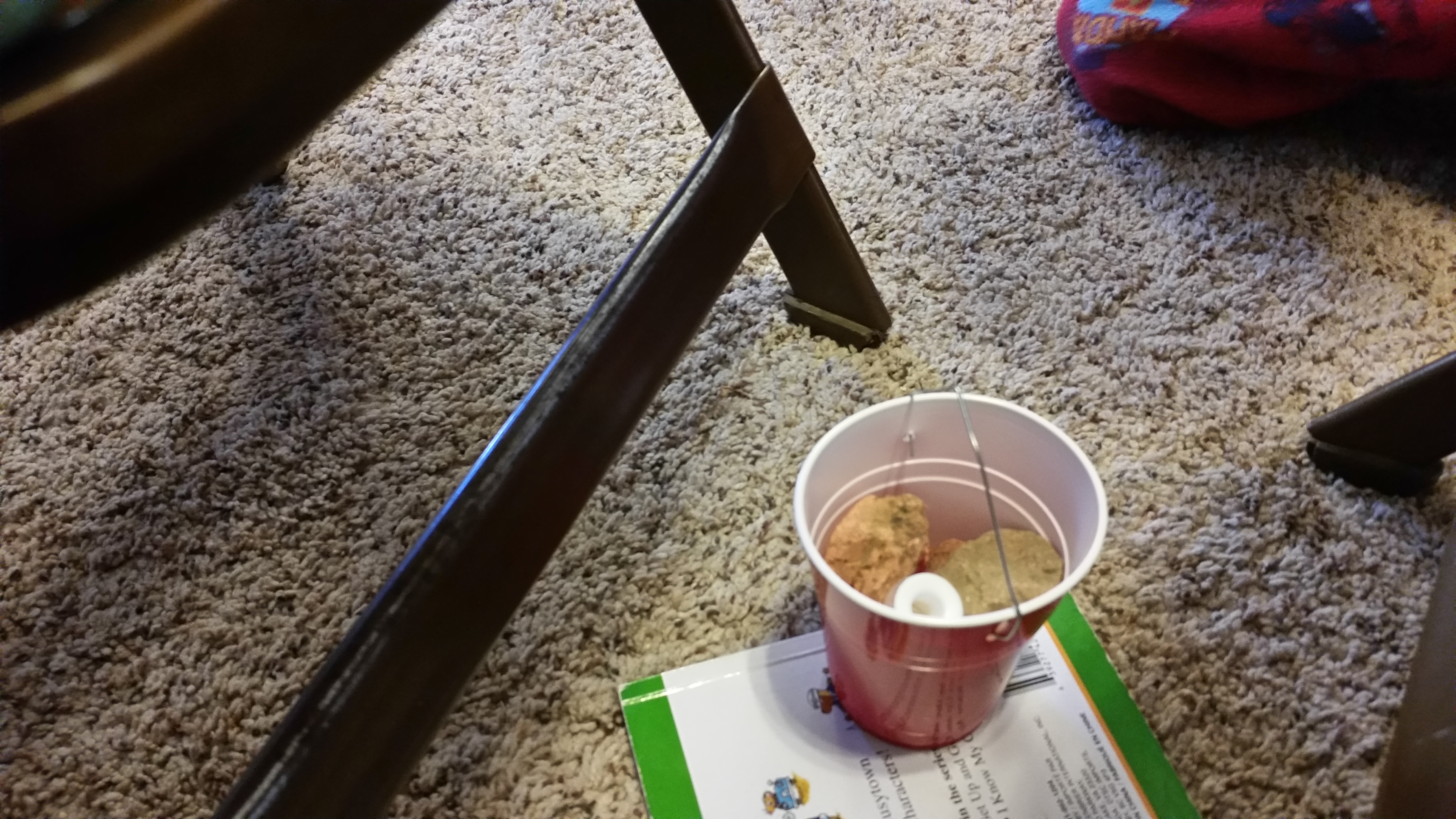 Joe dropped rocks from his rock collection in the cup. The more the cup bent the straw, the weaker the straw became so we replaced it with another straw to start the game all over again.