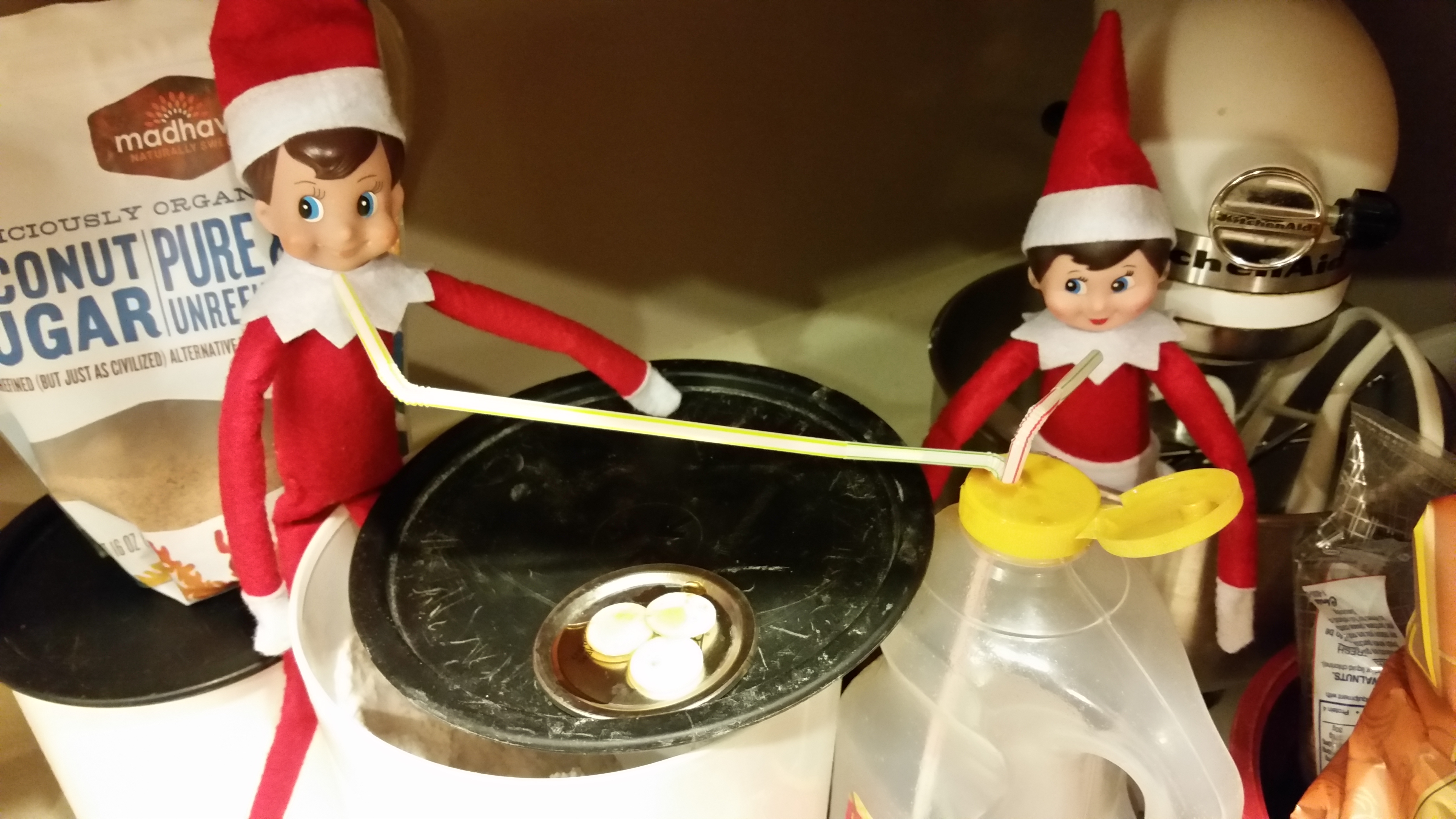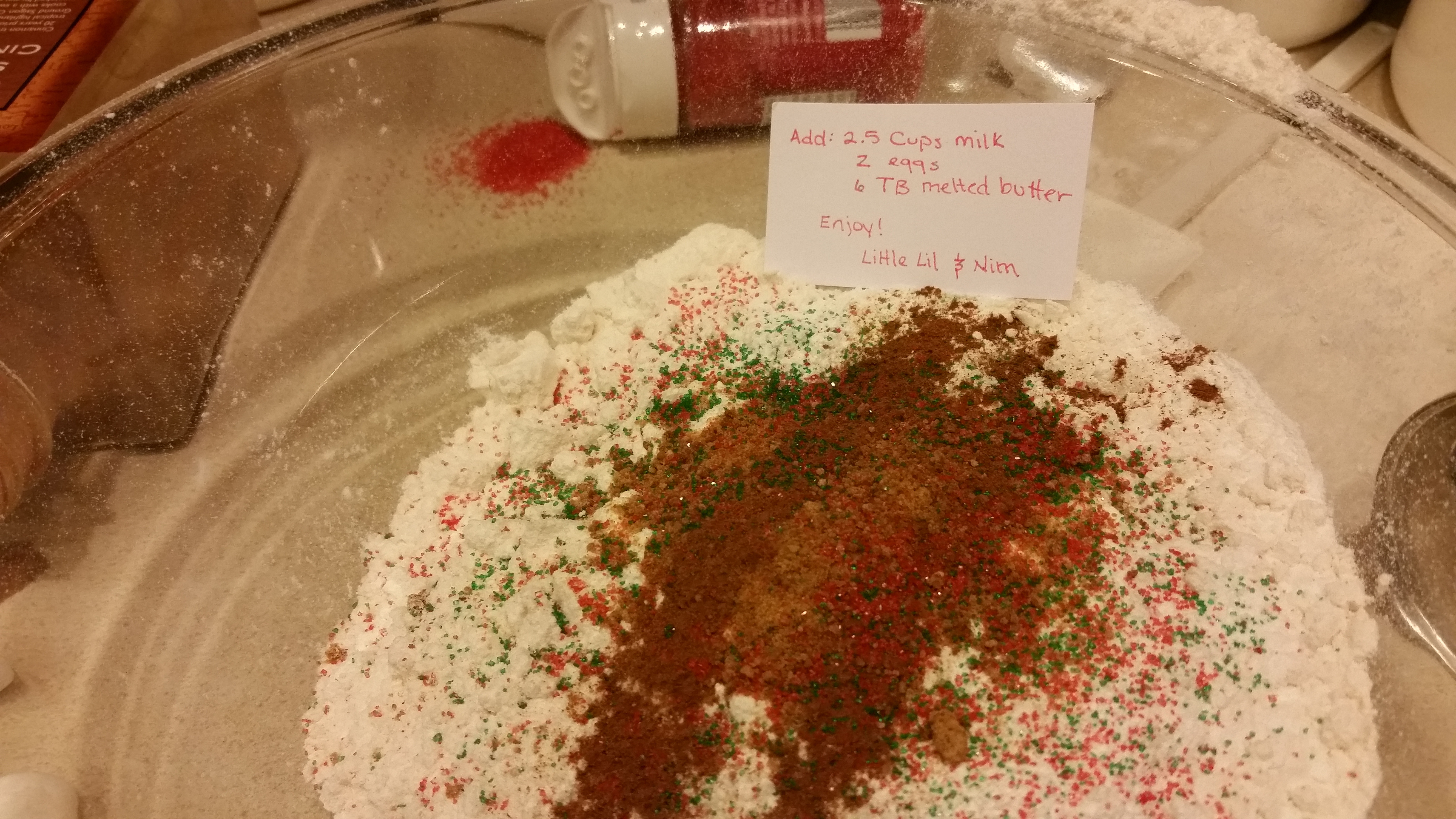 After pouring three cups of flour, 3 tablespoons of baking powder, a bit of sugar, a dash of cinnamon, a pinch of salt and enough red and green sprinkles to cover a dozen cookies into a big bowl, Nim and Lil fell in a jumbled heap on the counter.