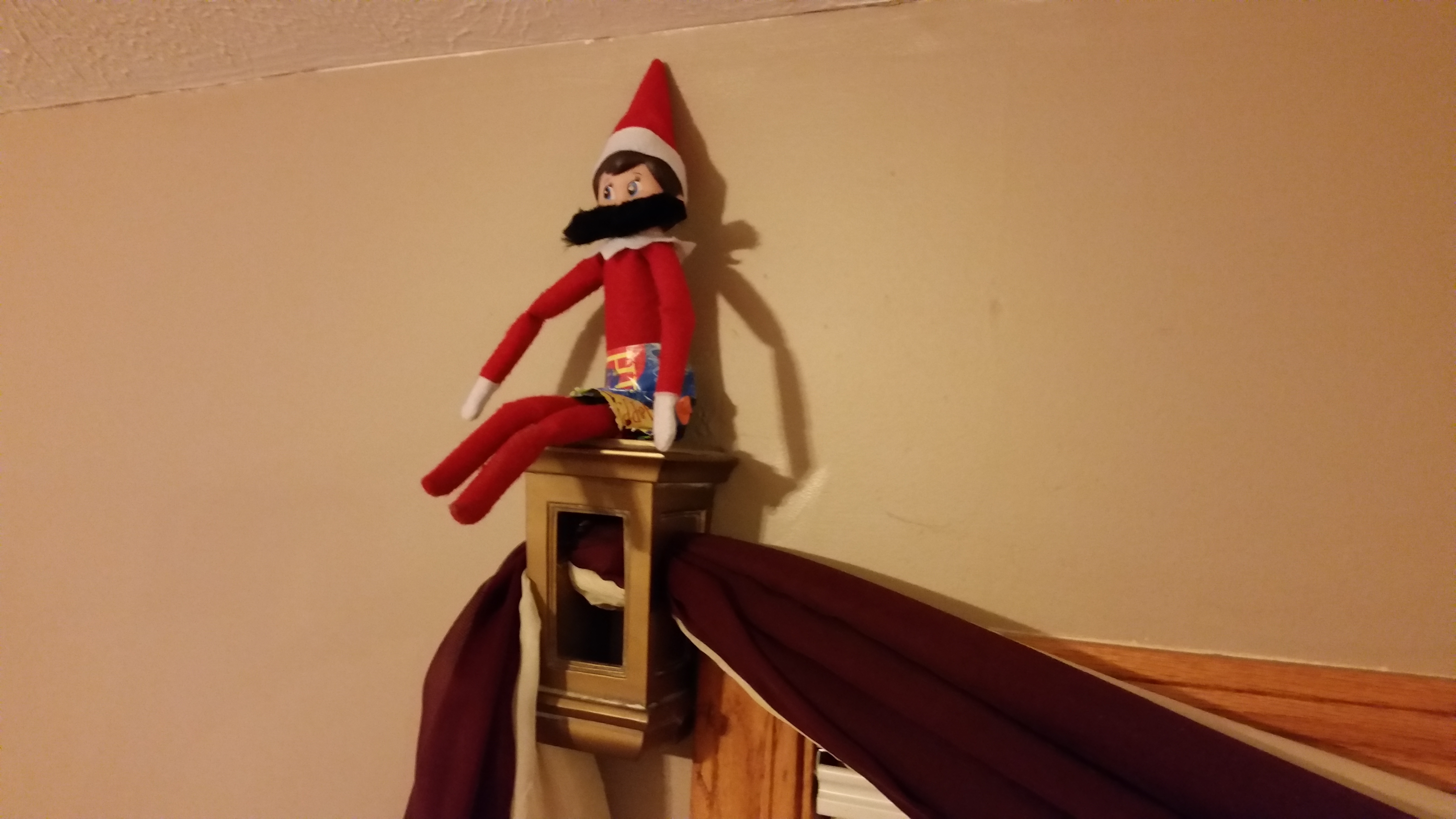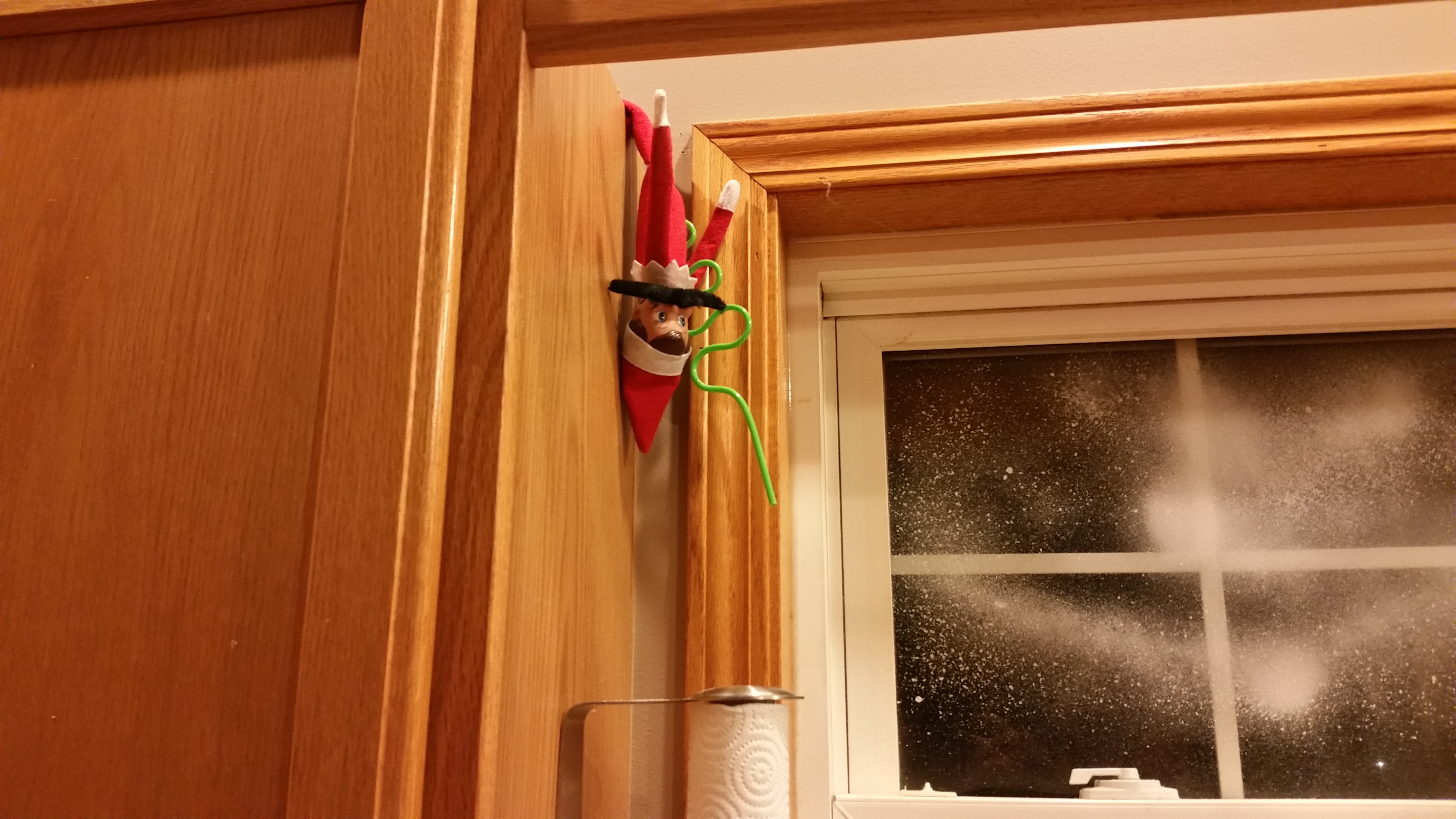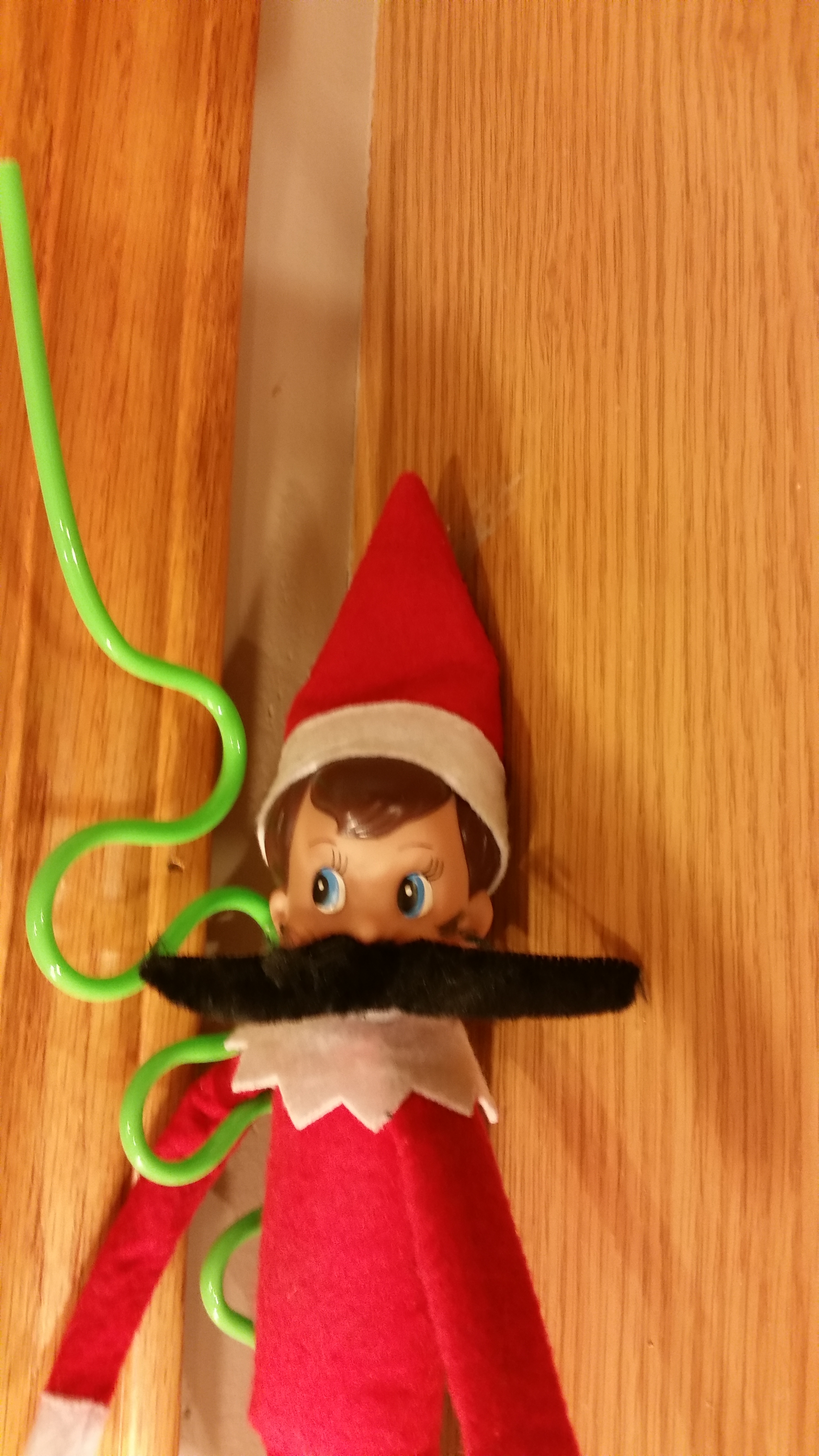 The nimble elves searched through cabinets for supplies. Nim began cutting mustaches out of black construction paper and taping them at random around the room.