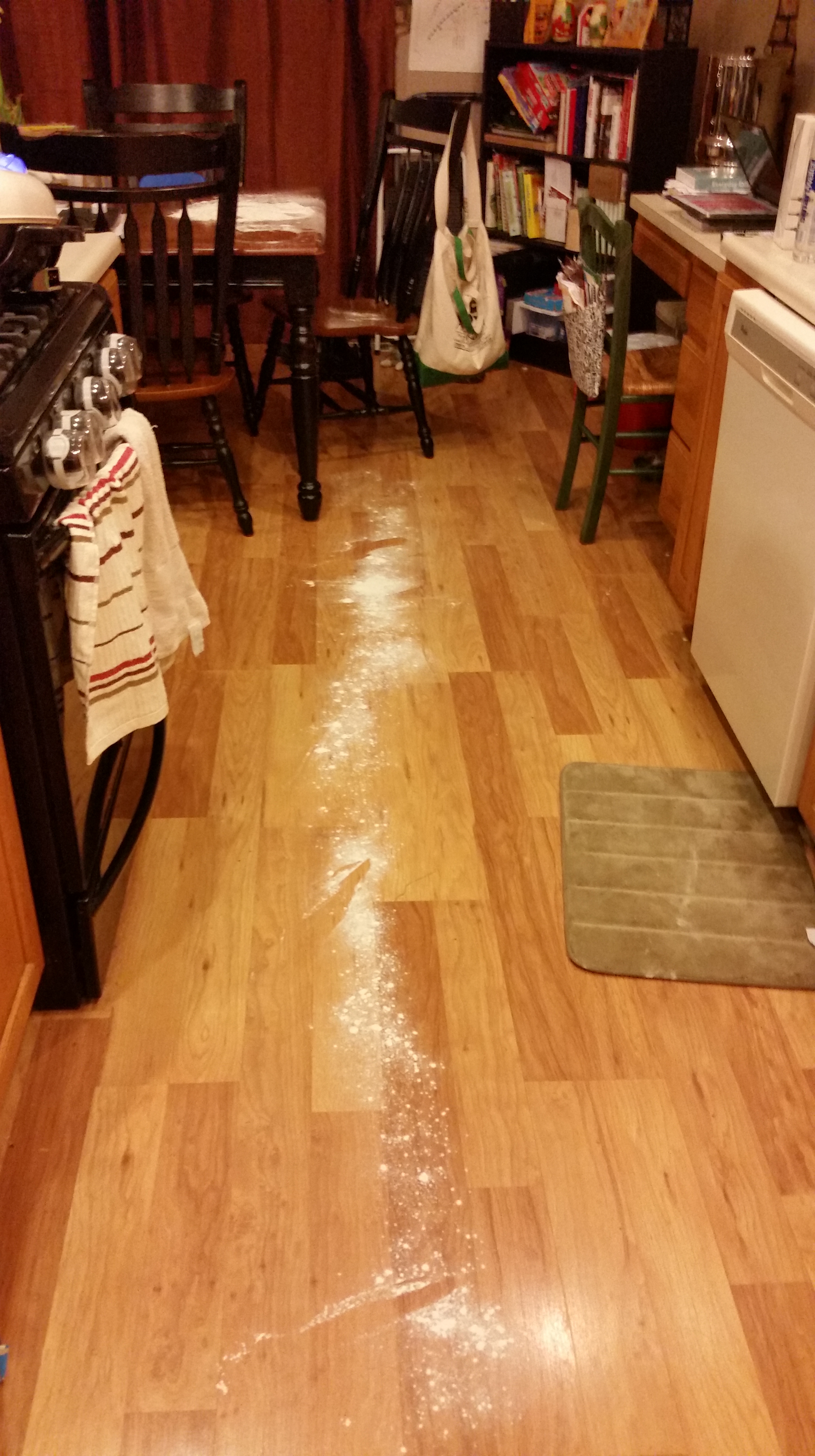 Rather than carrying the canister to the table, as he could have done with a little pixie dust, Nim scooped up handfuls and flew the flour over to the kitchen table. With each trip, he left a path of “snow” on the floor.