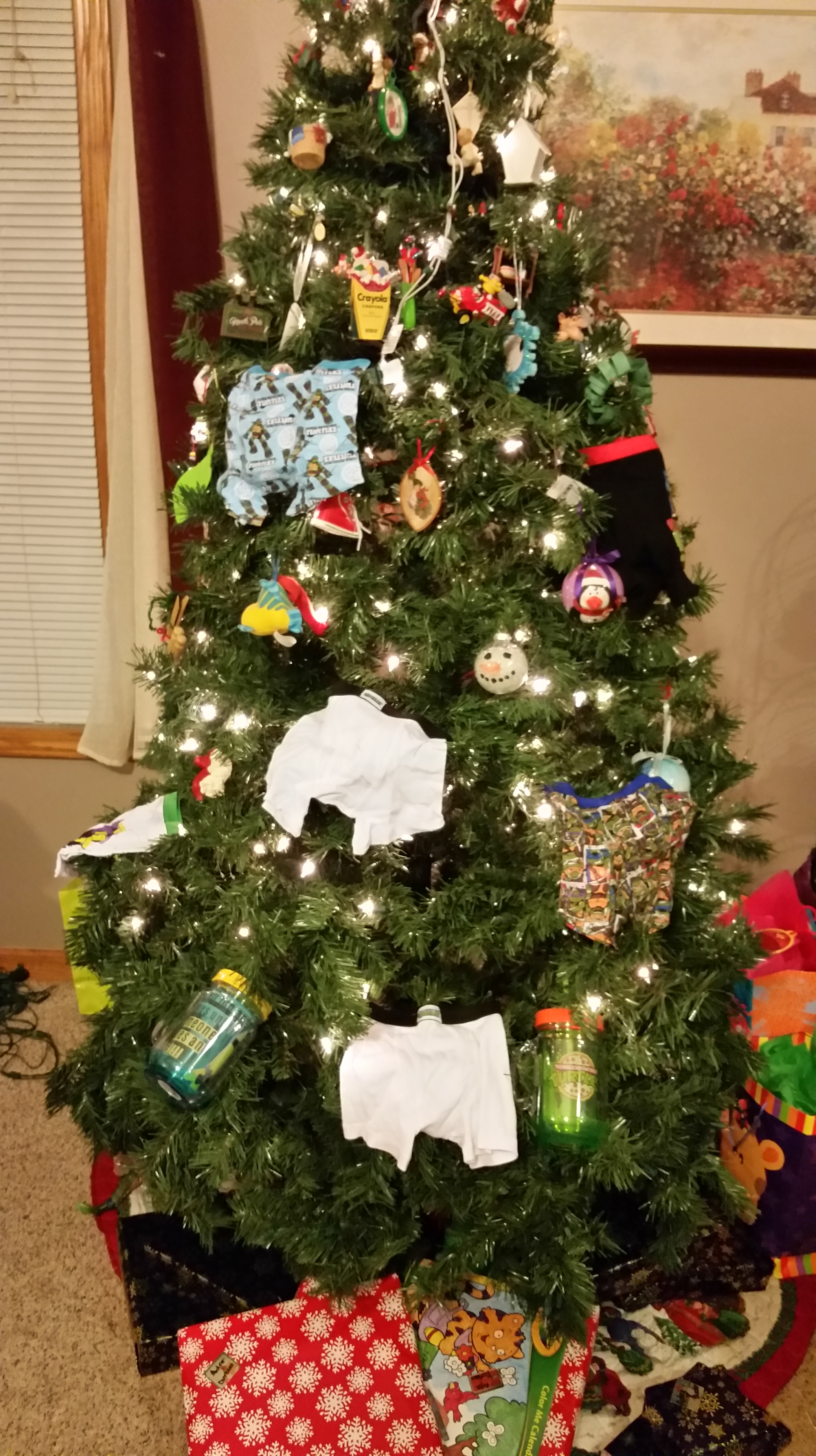 For example, Lil had squashed his idea of decorating the tree with the kid’s undies.