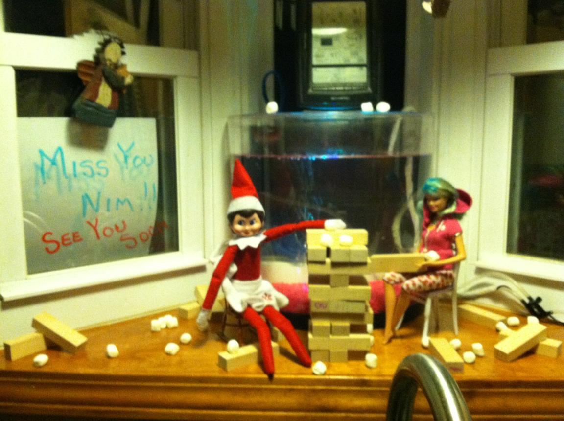 Then, she soared over to the window ledge above the kitchen sink and built a Jenga block wall, pelting Barbie with mini marshmallows until she heard the girls coming down the stairs.