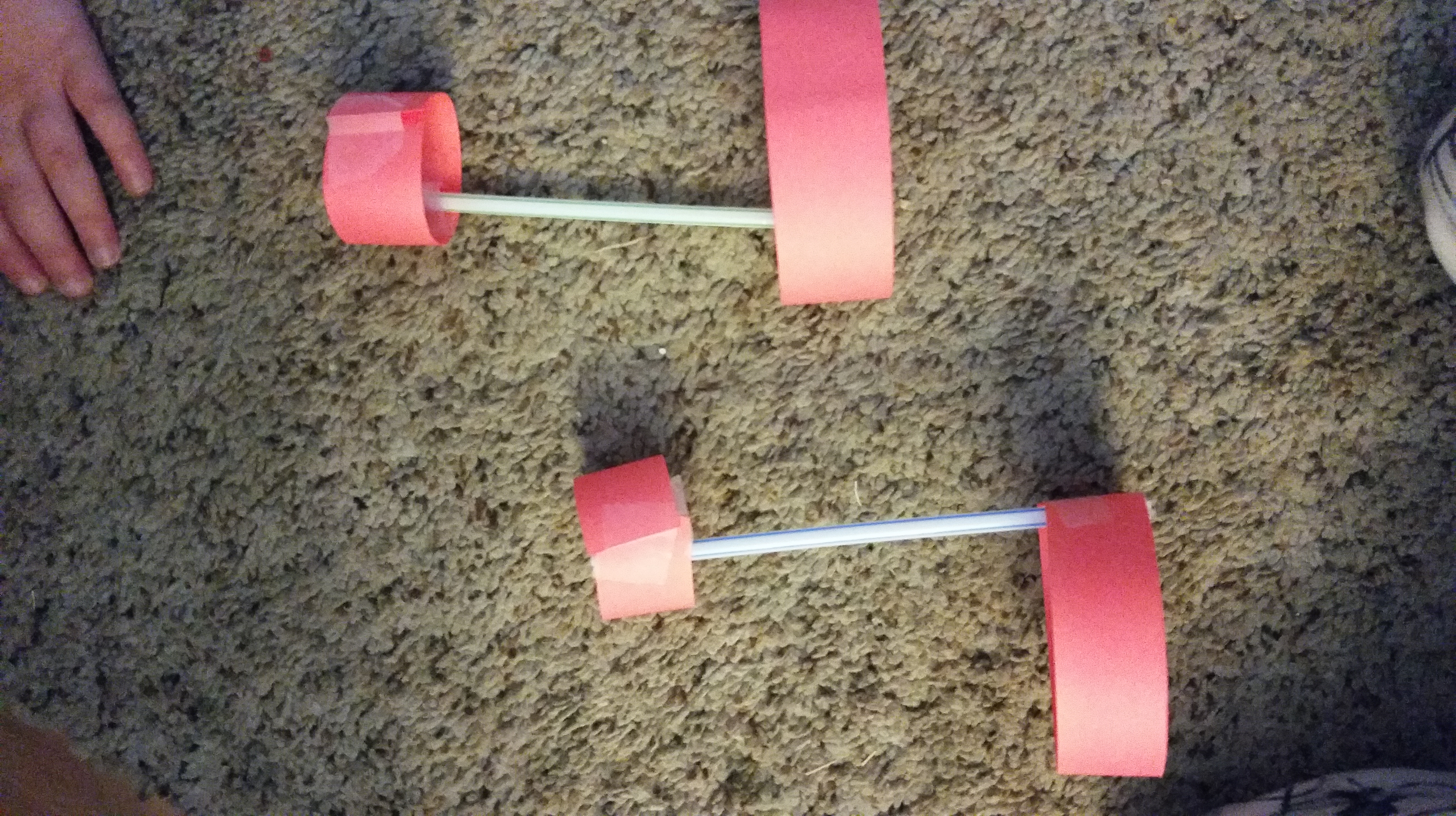For these, we used a straw, cardstock and tape. We cut a 1″ x 5″ piece and a 1″ by 10″ piece, taped them into a circle and taped each circle on the ends of the straw.