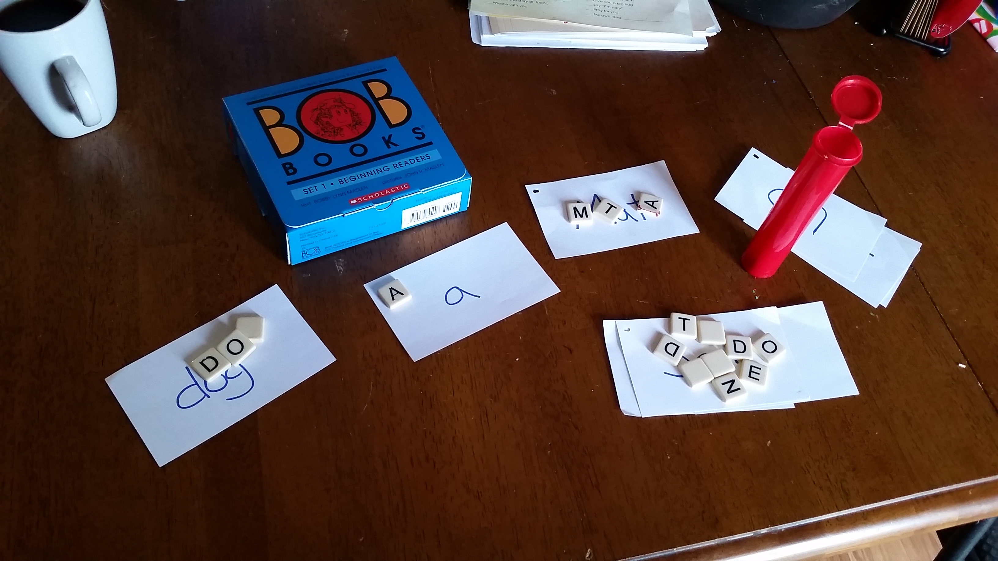 After he had worn himself out shaking the tube, or when I had had enough of the noise, he dumped the letters out and I handed him the first card.