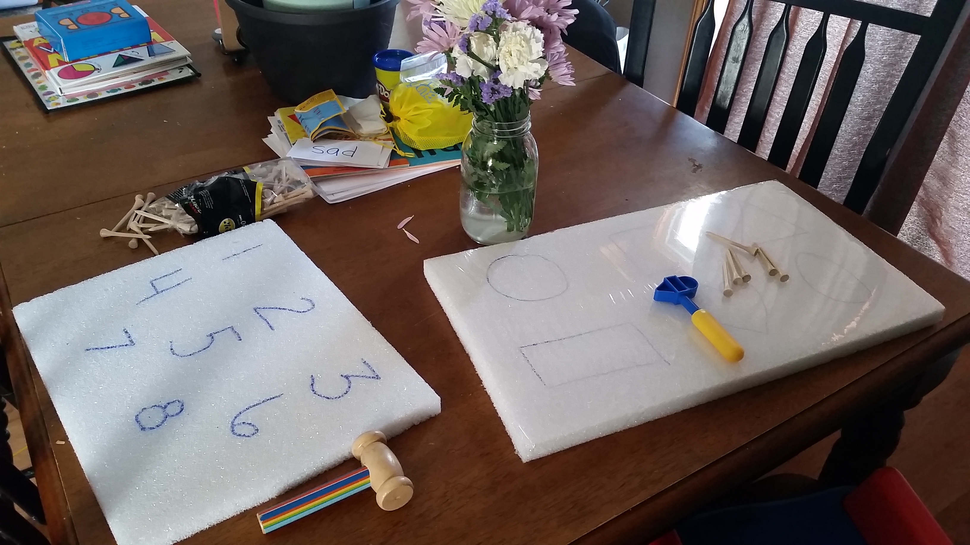 Monday, I wrote numbers for Joe and drew shapes for Jake on pieces of styrofoam. I dumped out a bag of golf tees and handed each of them a toy hammer from their toolsets.