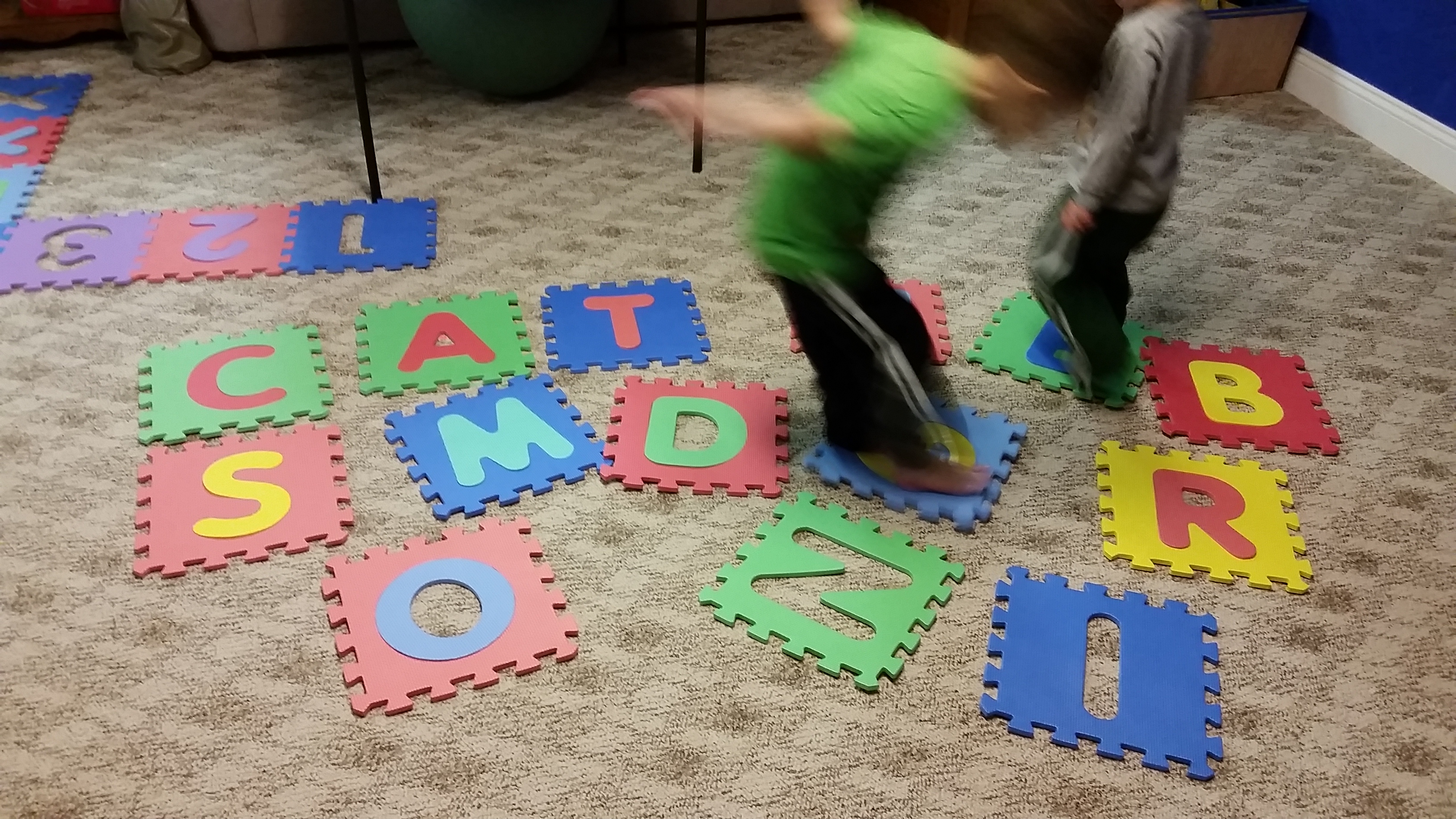 Next, I told him to jump to each letter, shouting it out with each hop.