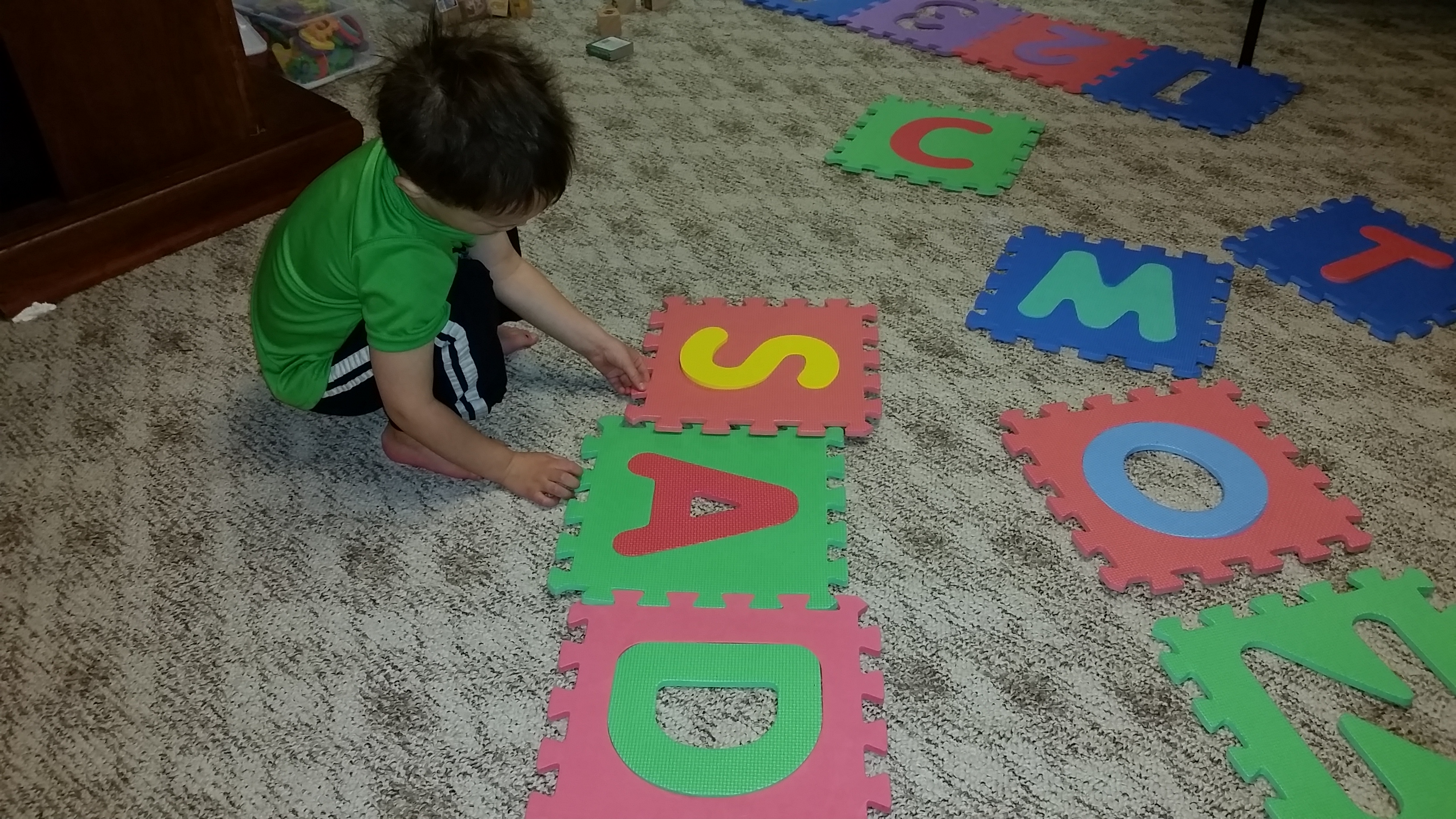 Tuesday, I got out the giant foam letter puzzle and scattered the letters all over the floor. Then I held up a word from the Bob Books we’ve read so far and asked him to find the letters and put them together.
