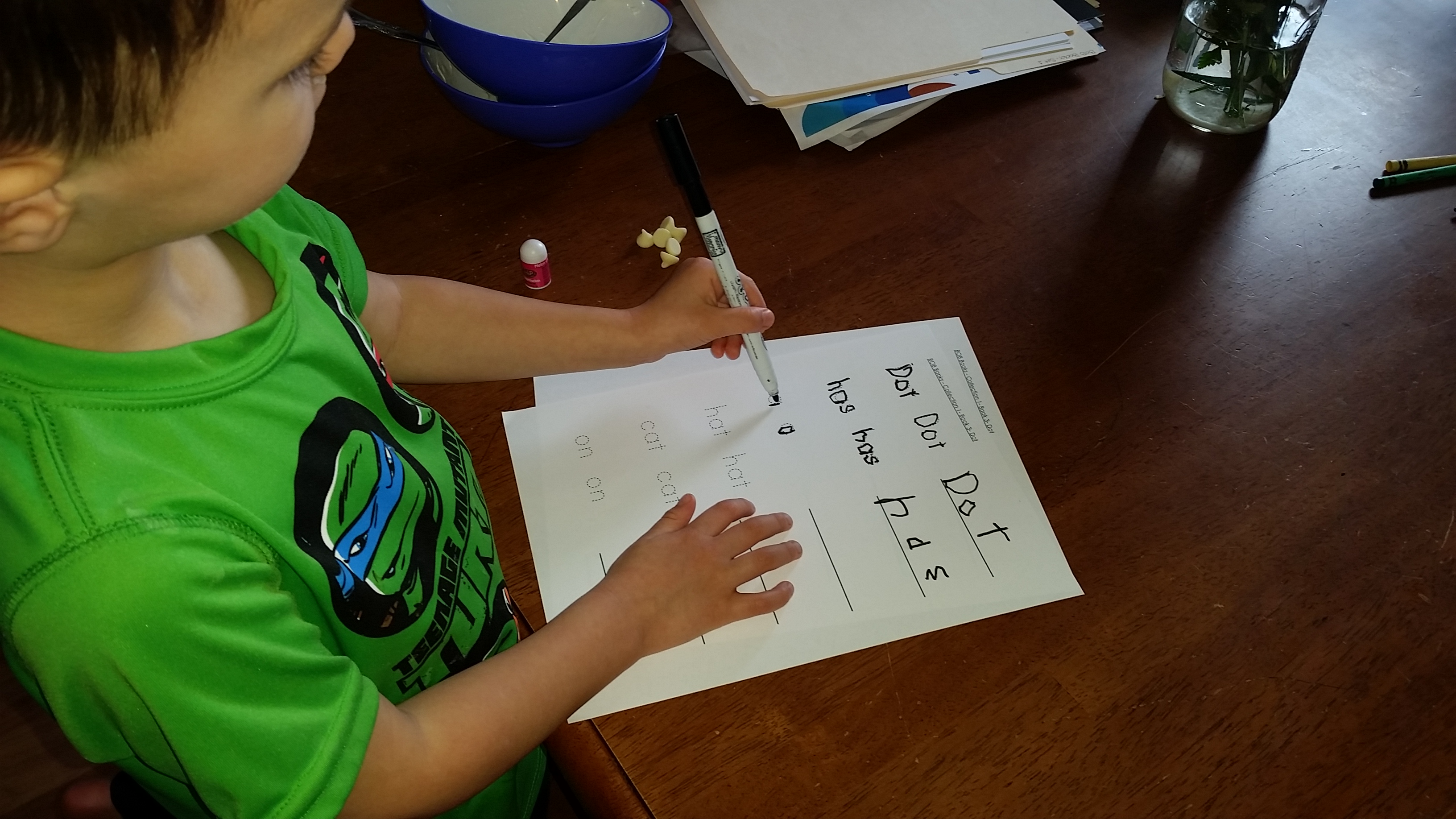 After this rather exhausting activity, we went upstairs and I gave Joe a sheet with words from the Bob Books and Jake a few coloring pages. Joe traced each word twice, then wrote it on his own.