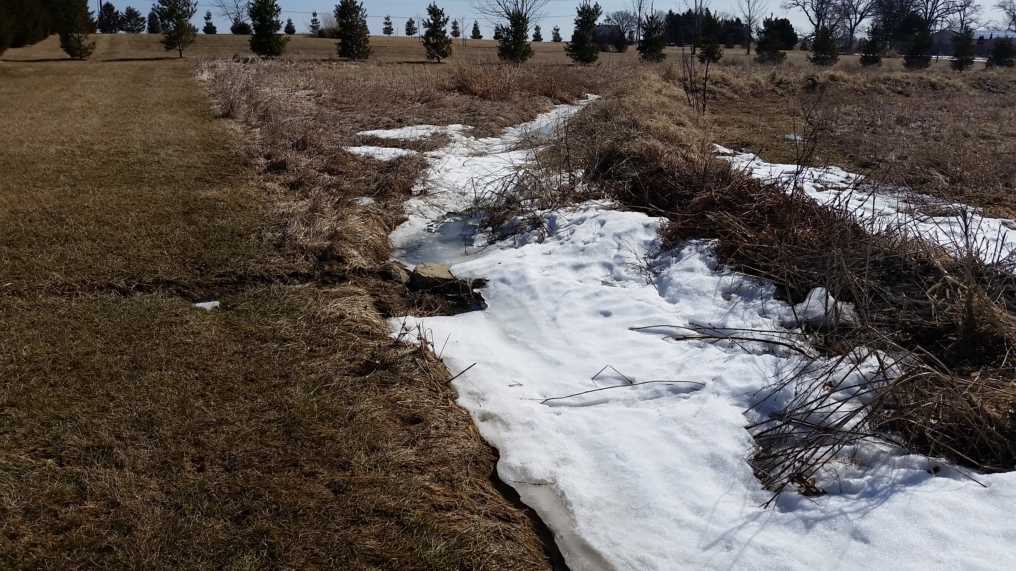 We walked back to the pastures to check the swales. The snow and ice were melting and the swales and spillways were full and brimming.
