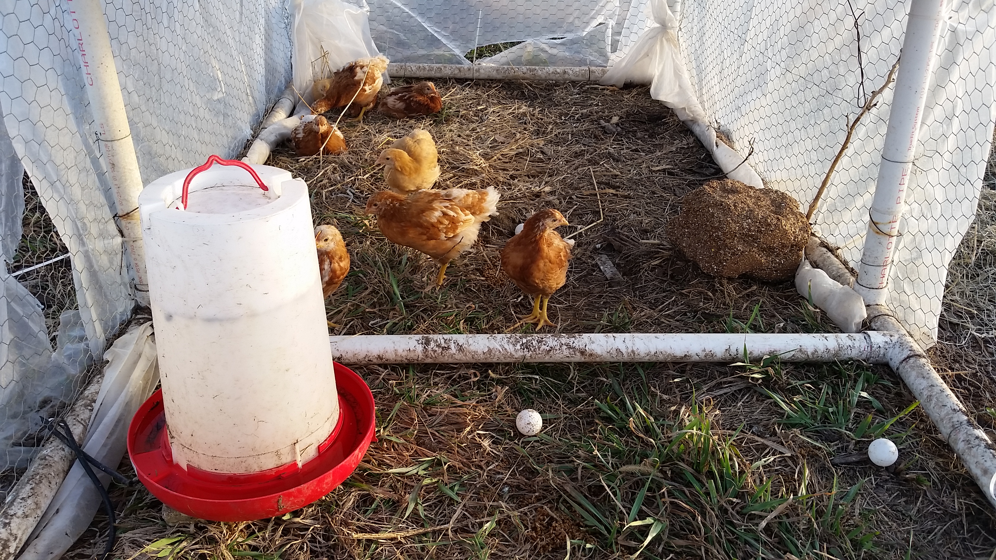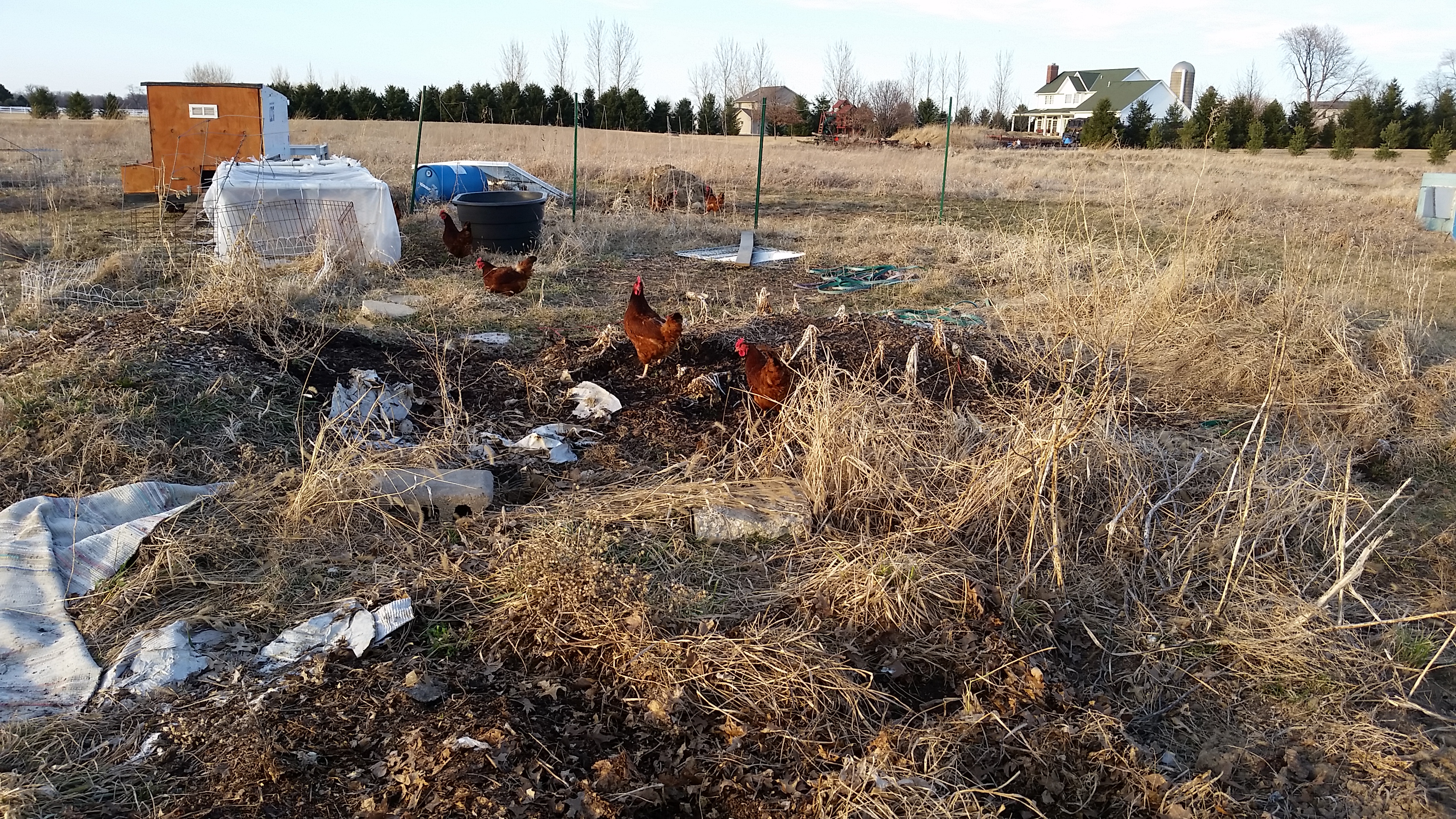 While Joe and I watered the plants in the greenhouse, Ray and his dad were busy cleaning out the coop. The hens were running around, eliminating potential threats in the back gardens and the pullets were exercising in the big playpen.