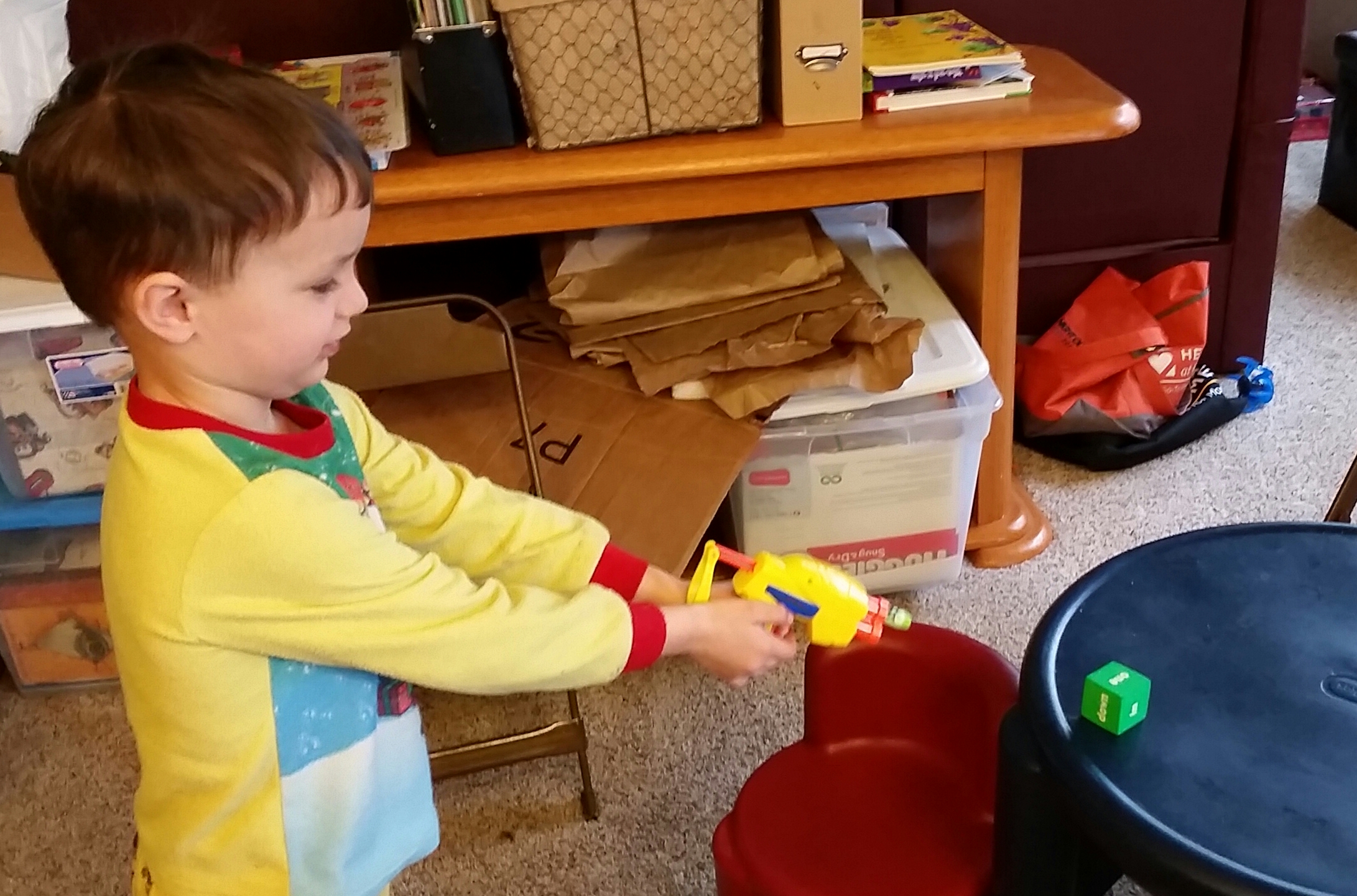 Then, Joe rolled the die, sounded the word out and then shot the matching cup. He recognized quite a few and was able to get a few more by sounding them out.