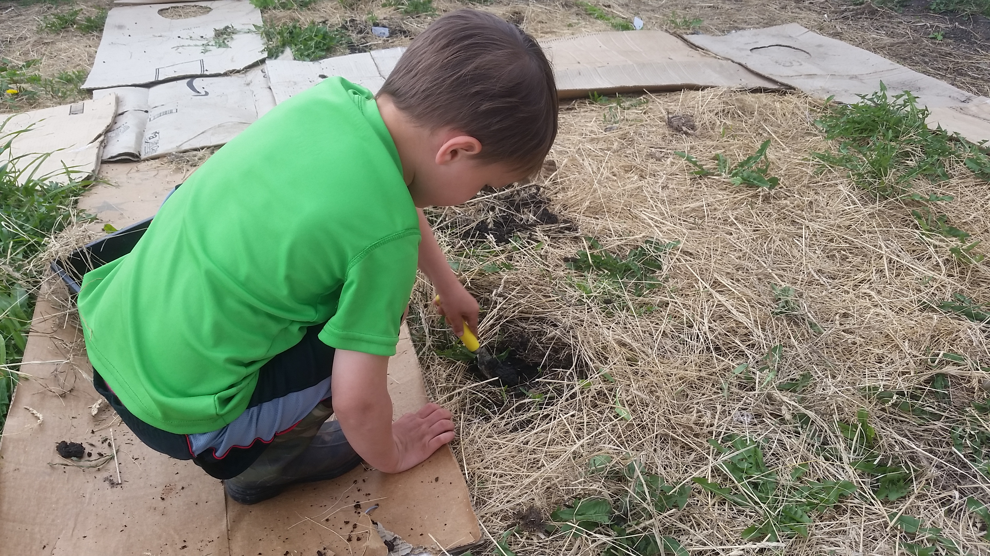We had to make sure that the hole was deep enough to bury the plant up and over the bottom leaves in the hope that new roots will grow and make them stronger. For the best results and the strongest plant, only the top few inches of the plant should be sticking out of the ground.