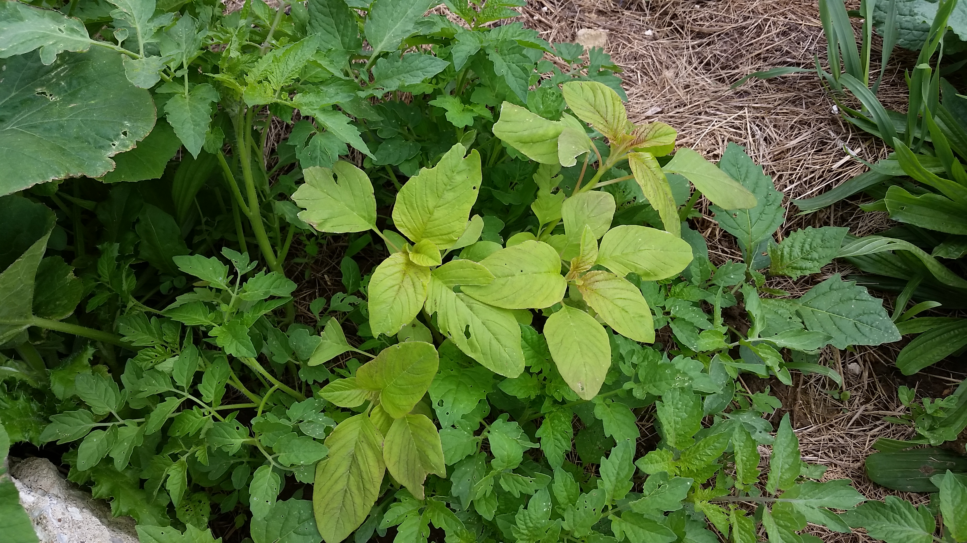 But the same type of amaranth, planted at the same time, is thriving at the opposite end.