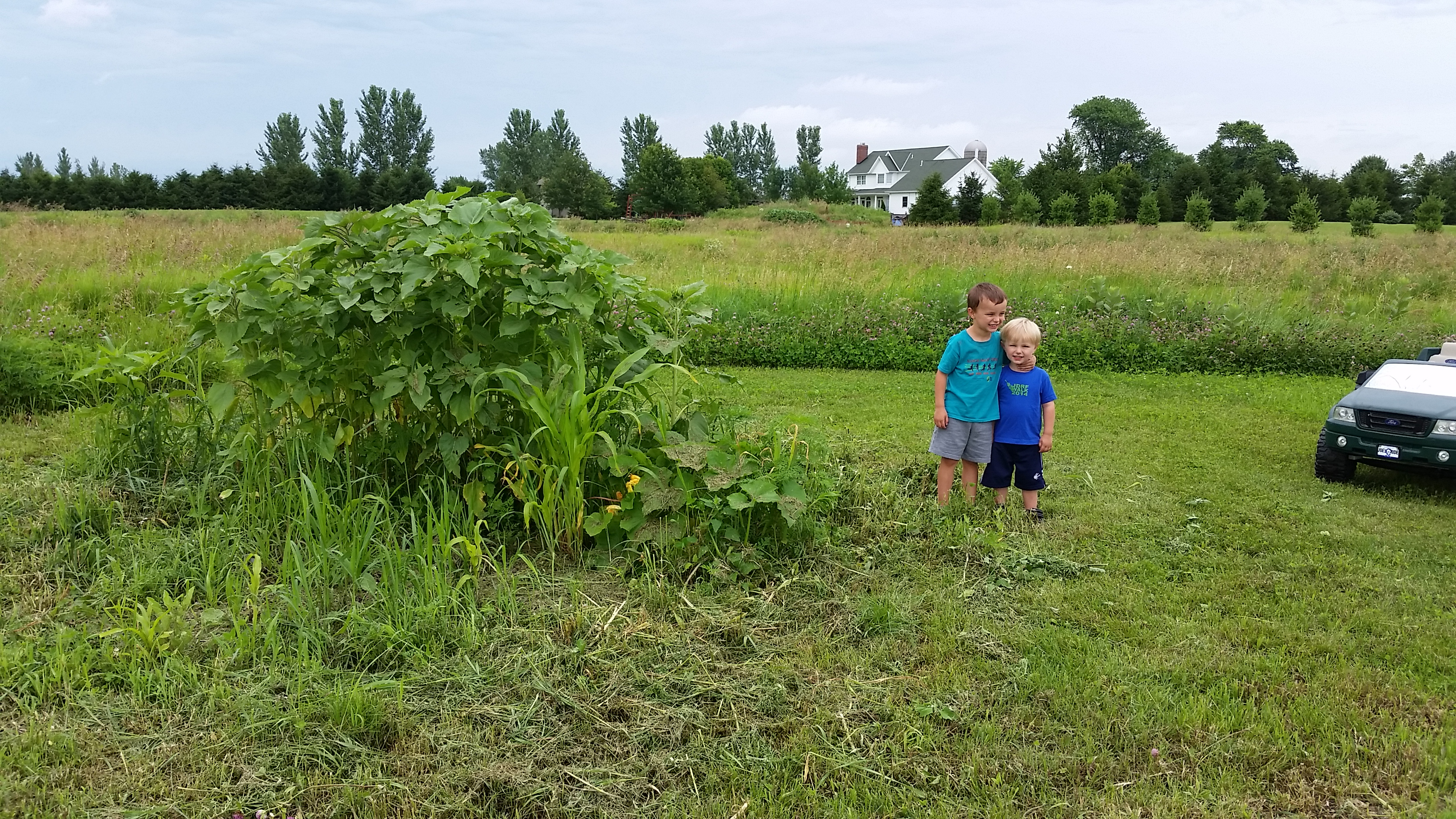 The sunflowers and jerusalem artichokes are both climbing higher and higher and have outstripped the boys in height.