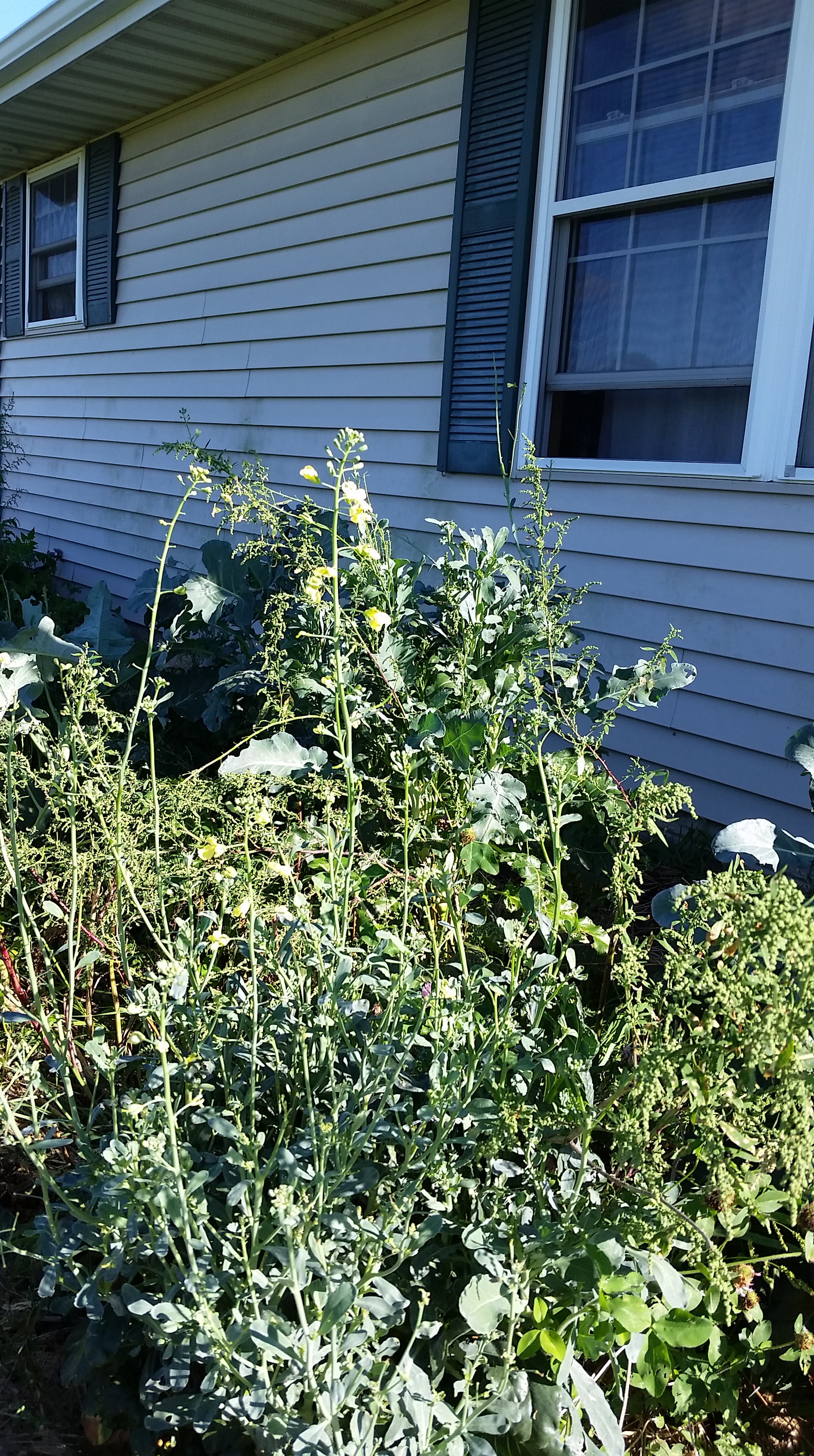 The broccoli, viciously bombarded by the two Broccoli Bandits, is going to seed and some of the plants have new heads forming.