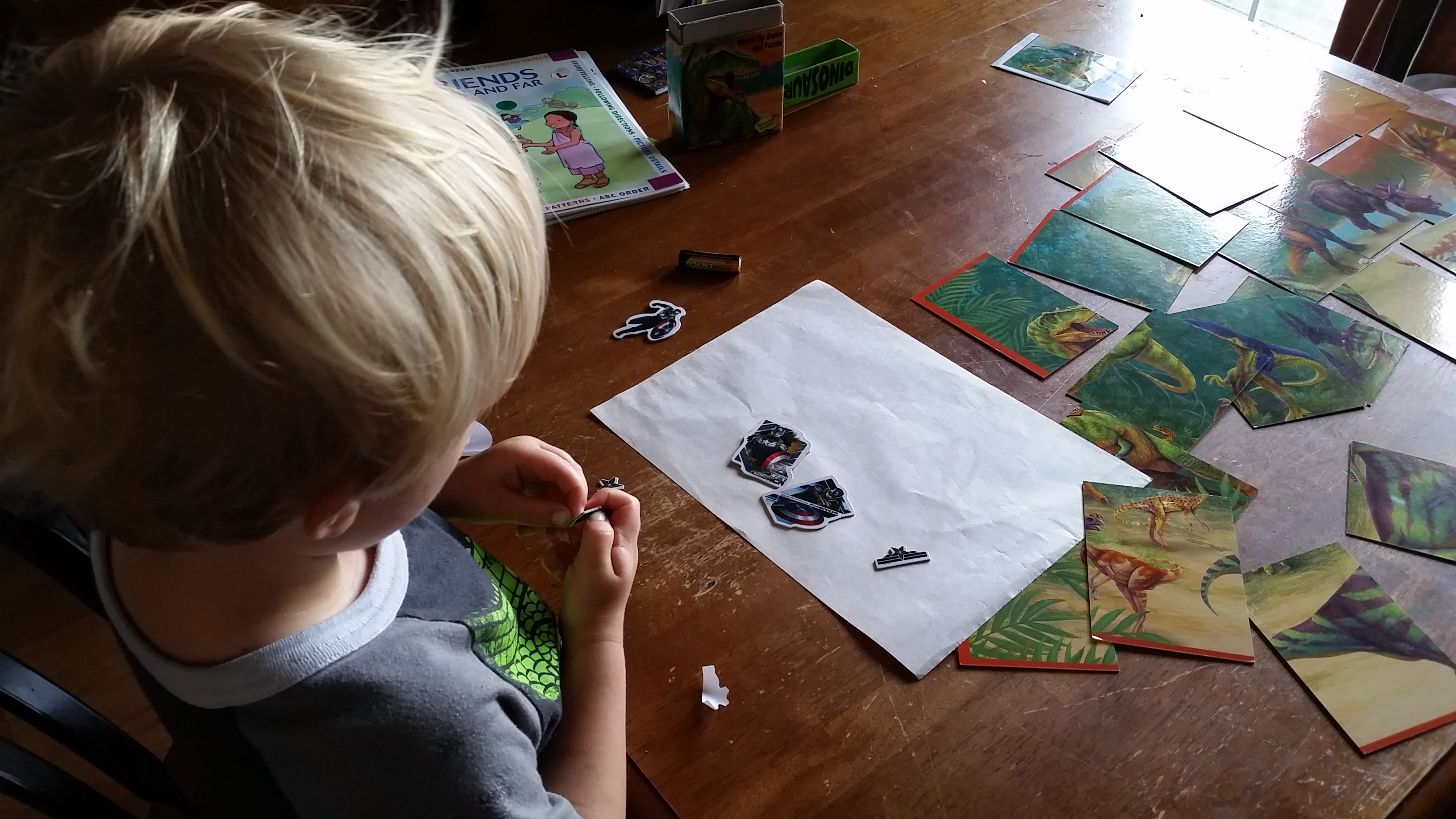 After we’d gone through all the sight words, I gave the boys a blank sheet of paper so they could stick their superheroes on…at least the ones they hadn’t stuck to their shirt, pants and coat.