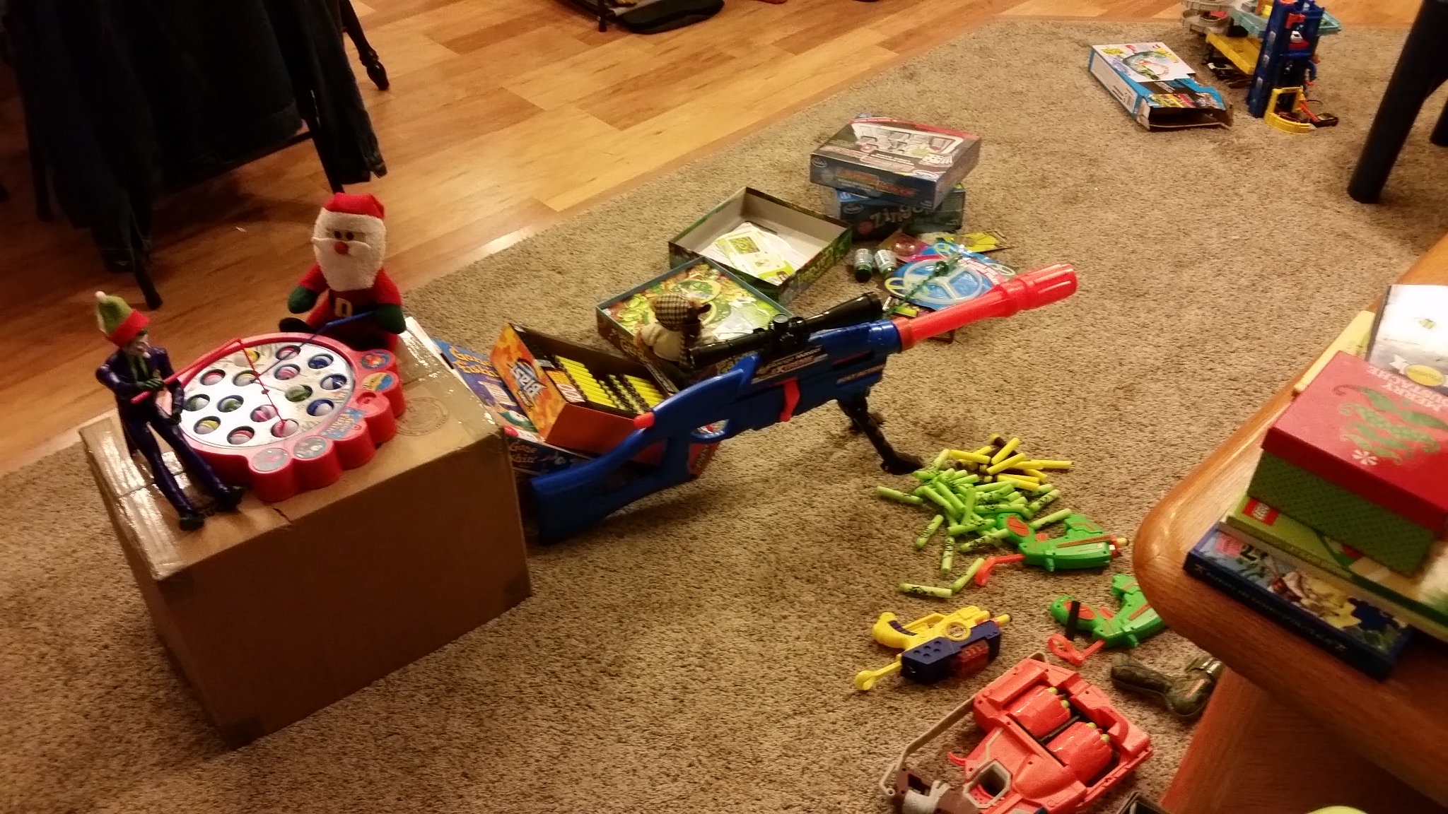 As you know, Joe’s birthday is in December. Well, his party was today and he got a TON of new toys. Games, nerf guns, clothes, nerf guns, books, nerf guns, Hotwheels and nerf guns.