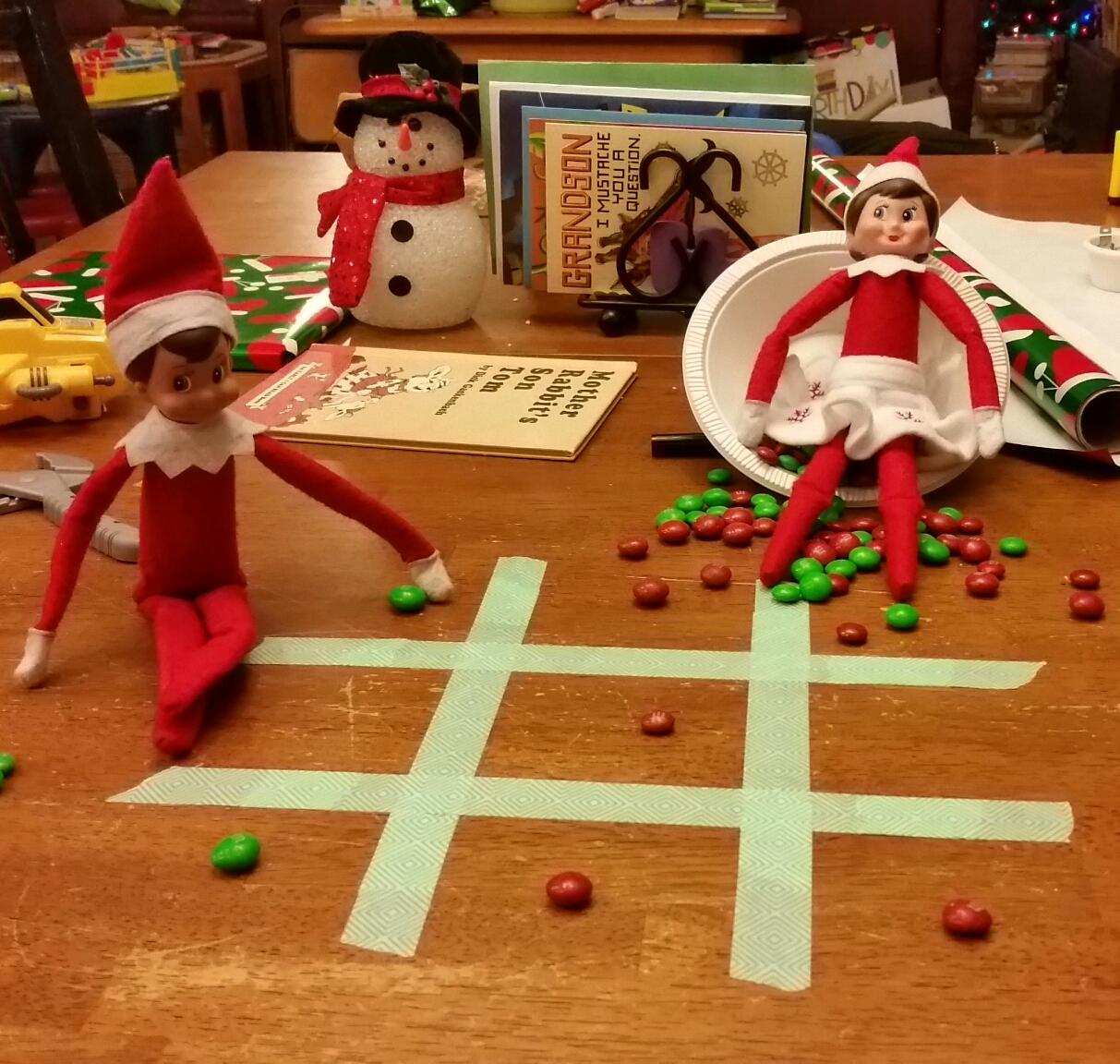 Nim and Lil sat at the kitchen table playing a game of tic-tac-toe with Christmas M&Ms.