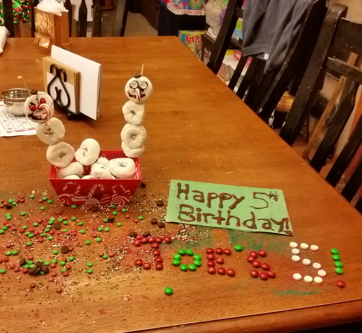 The sprinkles, icing, red hots, M&Ms and smarties were all left out from decorating the cookies, so I used them to make a sign and add a little festive decoration to the table…and floor.