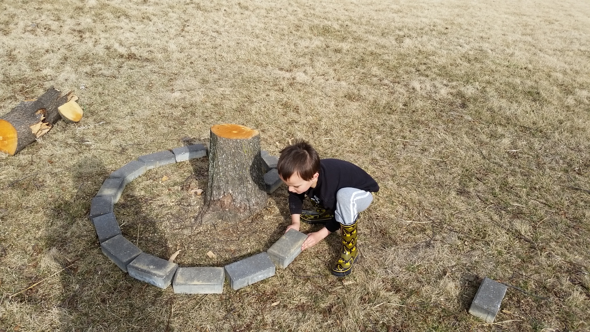 Next, we carted bricks to the stump of the climbing tree and created the outline for the herb spiral.