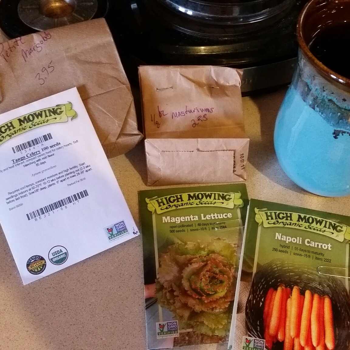 Today, I sowed more seeds and stuck them outside using the “Winter Sowing” technique detailed in a previous post. I also started a flat in the basement under grow lights.
