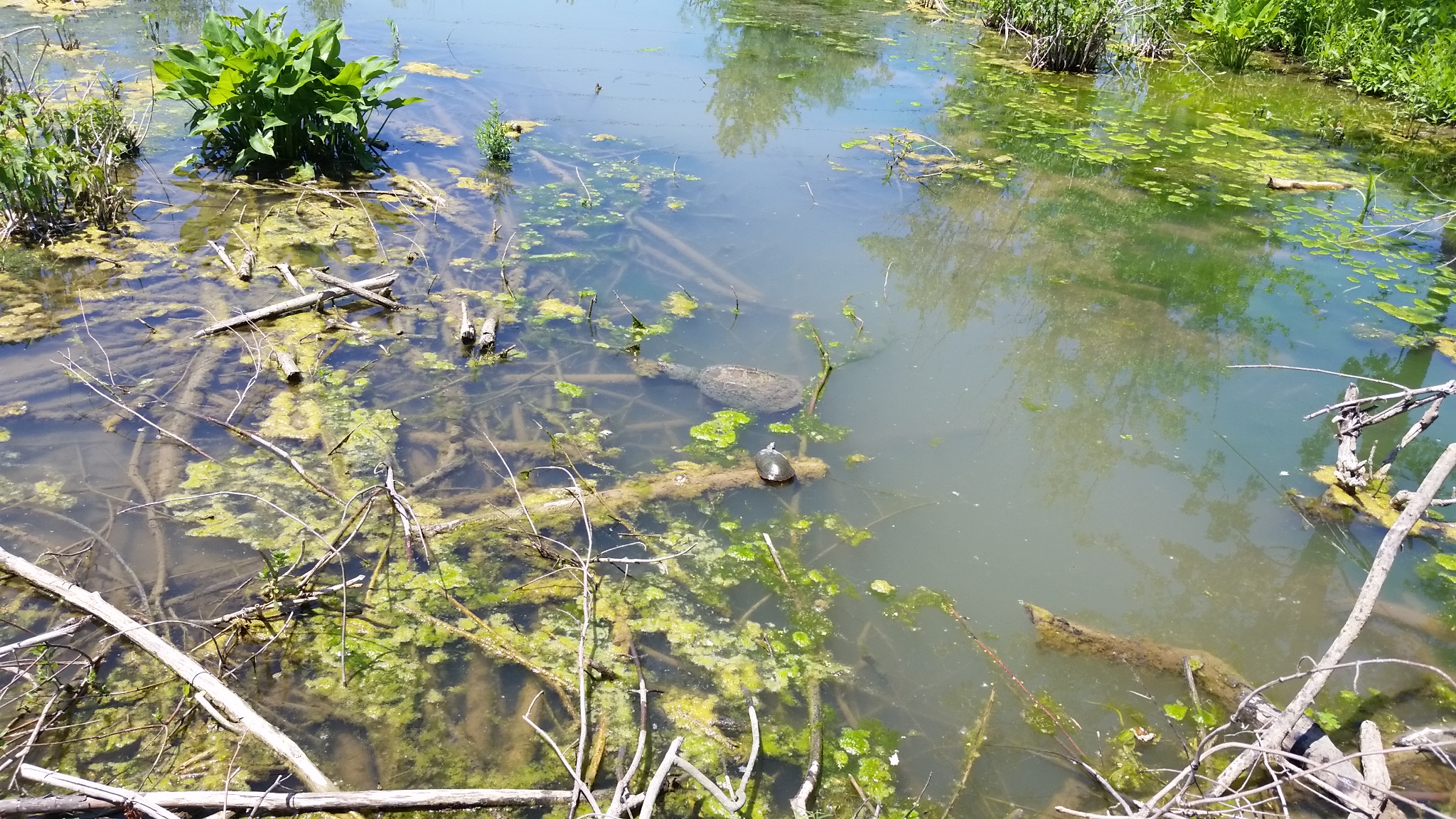 Tiny fish were swimming in the water, a few small turtles were sunning themselves on logs and a big snake was slithering through the tall weeds.
