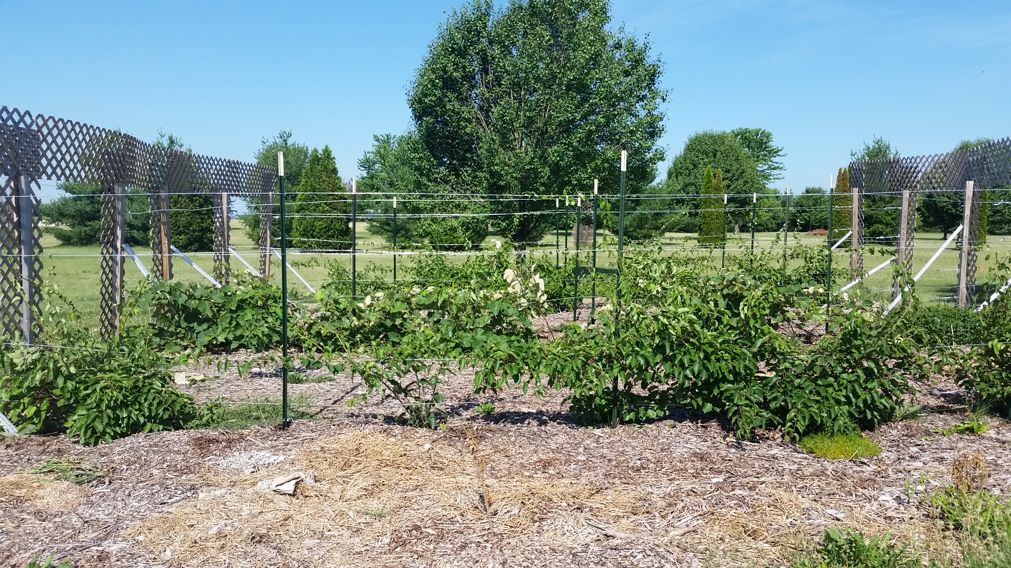 We added posts and wires to the vineyard so the kiwi and grapes could continue their upward climb.