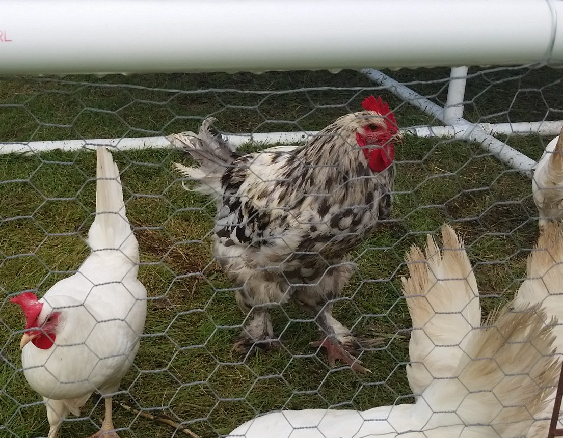 The old birds were moved to the strawberry bed. Their new coop, an upside down rubbermaid tote with a hole cut in it. The new girls were given access to the chicken tractor.