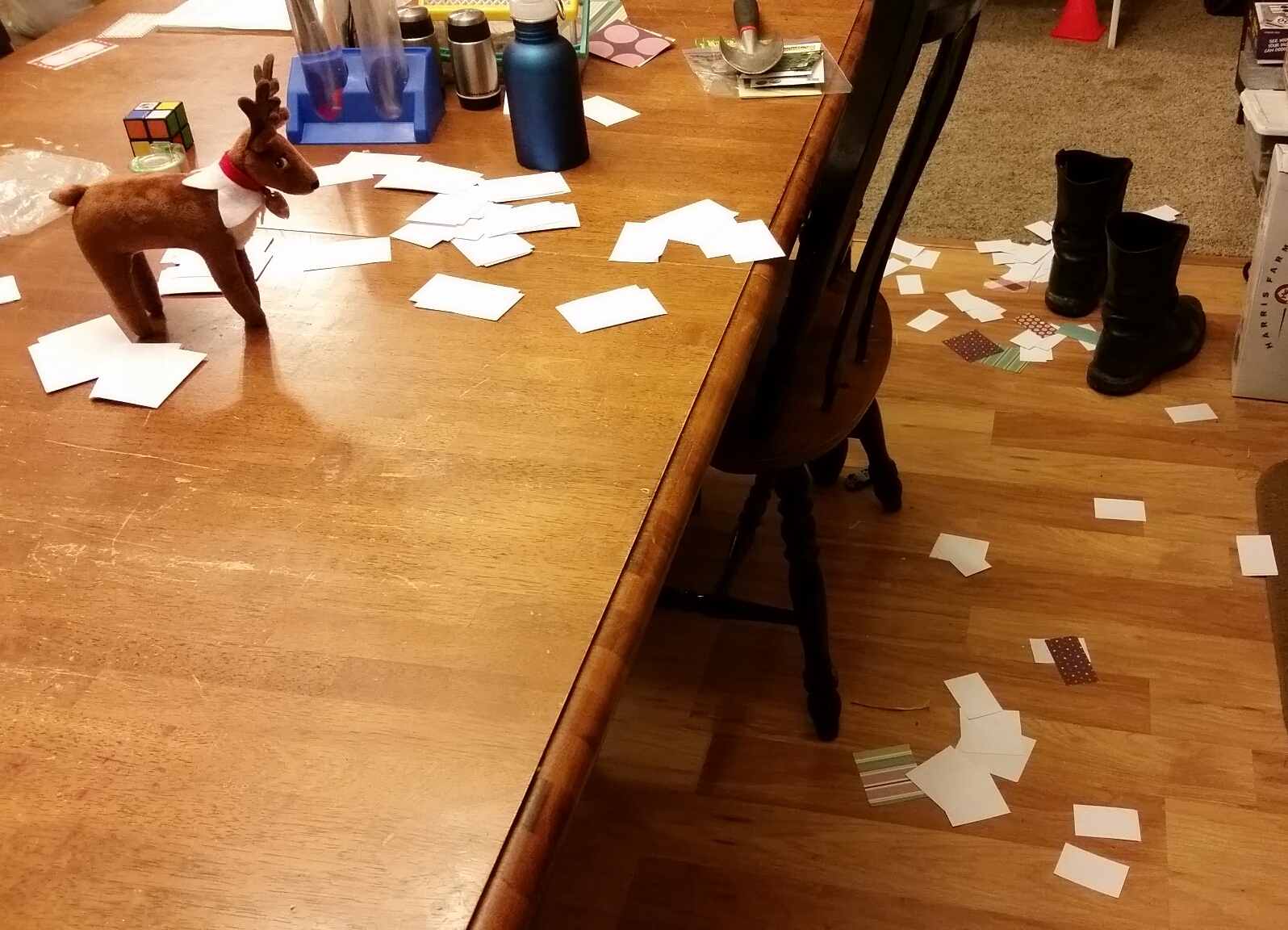 The poor, shocked reindeer stared open-mouthed at Nim as he busily scribbled the welcome message…one word on each scrap of paper.