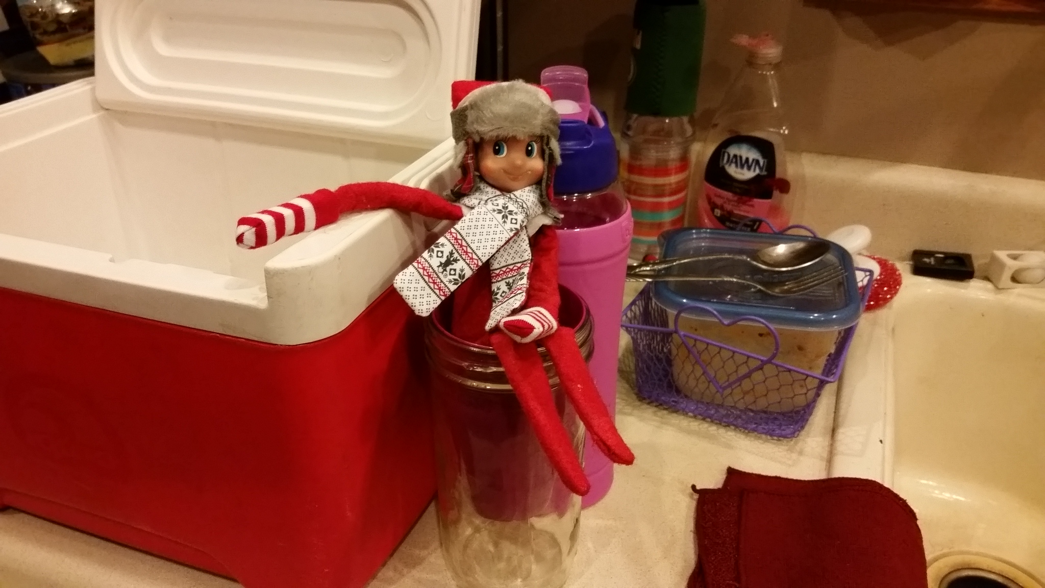 “No, we are having Elf Krispie Treats!” she yelled pouring an entire box of rice krispies all over Nim, the counter and the floor.