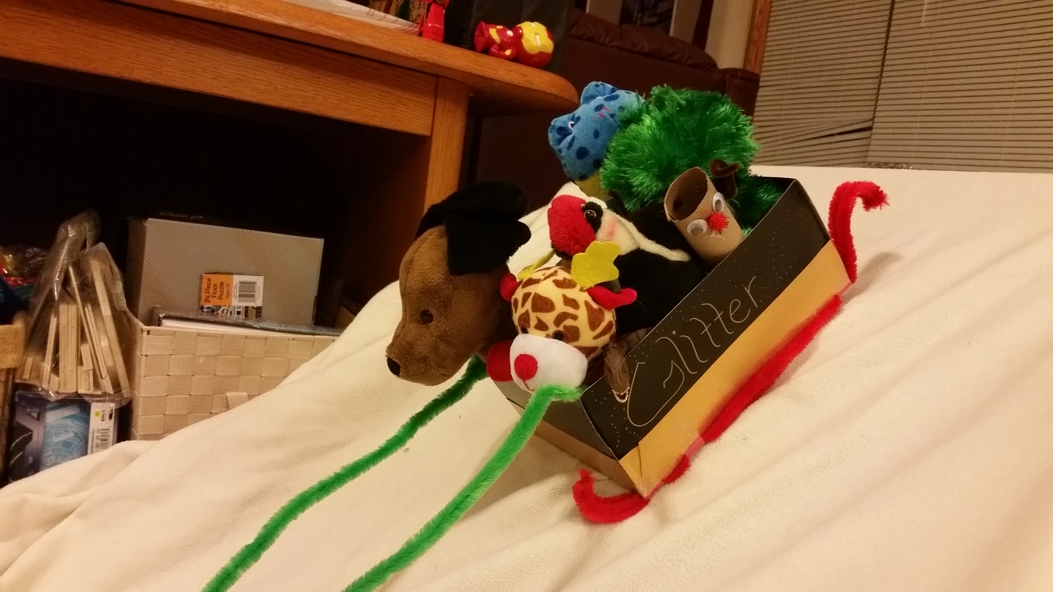By the time Nim had finished hauling all of the stuffed animals, dinosaurs and superhero toys from the boys’ room, Glitter had transformed an old shoebox into a beautiful sled.