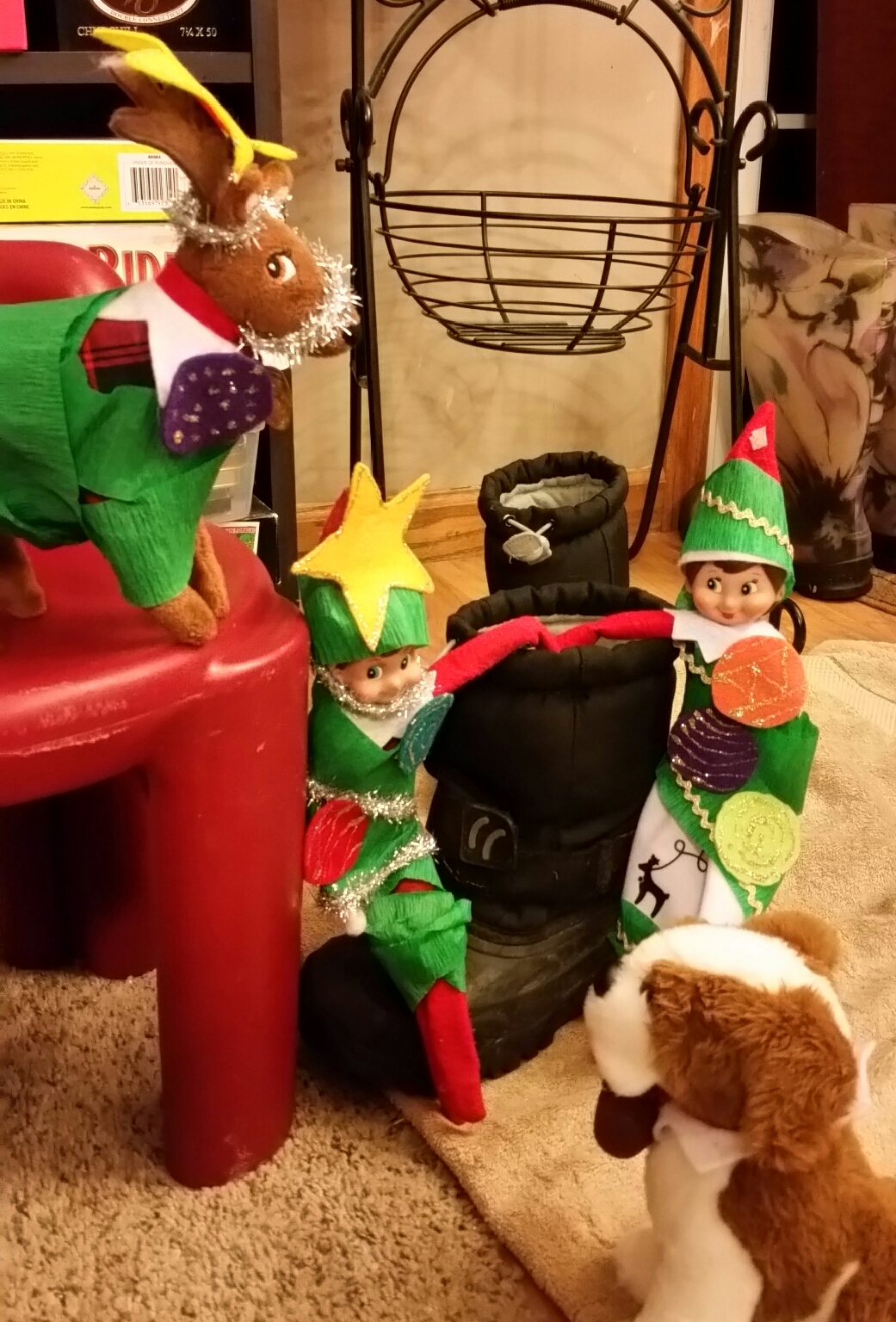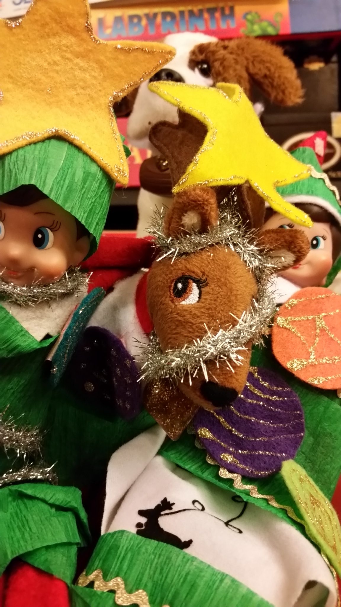 We thought you might have fun making yourselves into Christmas trees, so we left green streamers, garland and paper ornaments out for you. We even dressed Leonard up as a tree!