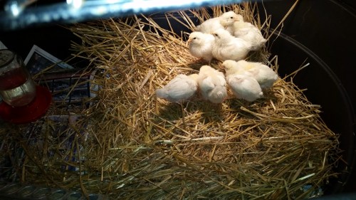We moved the chicks to the garage last night. They, mostly, have all their feathers so should be able to stay warm. Besides, they were getting way too big for their box.