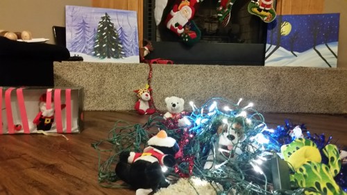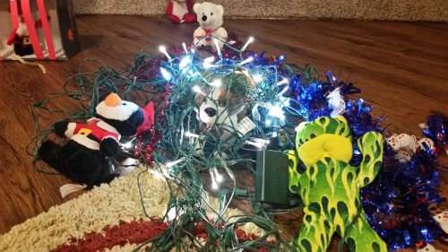 A mass of blinking white lights rolled around the living room in a tangle with Barrel at the center.