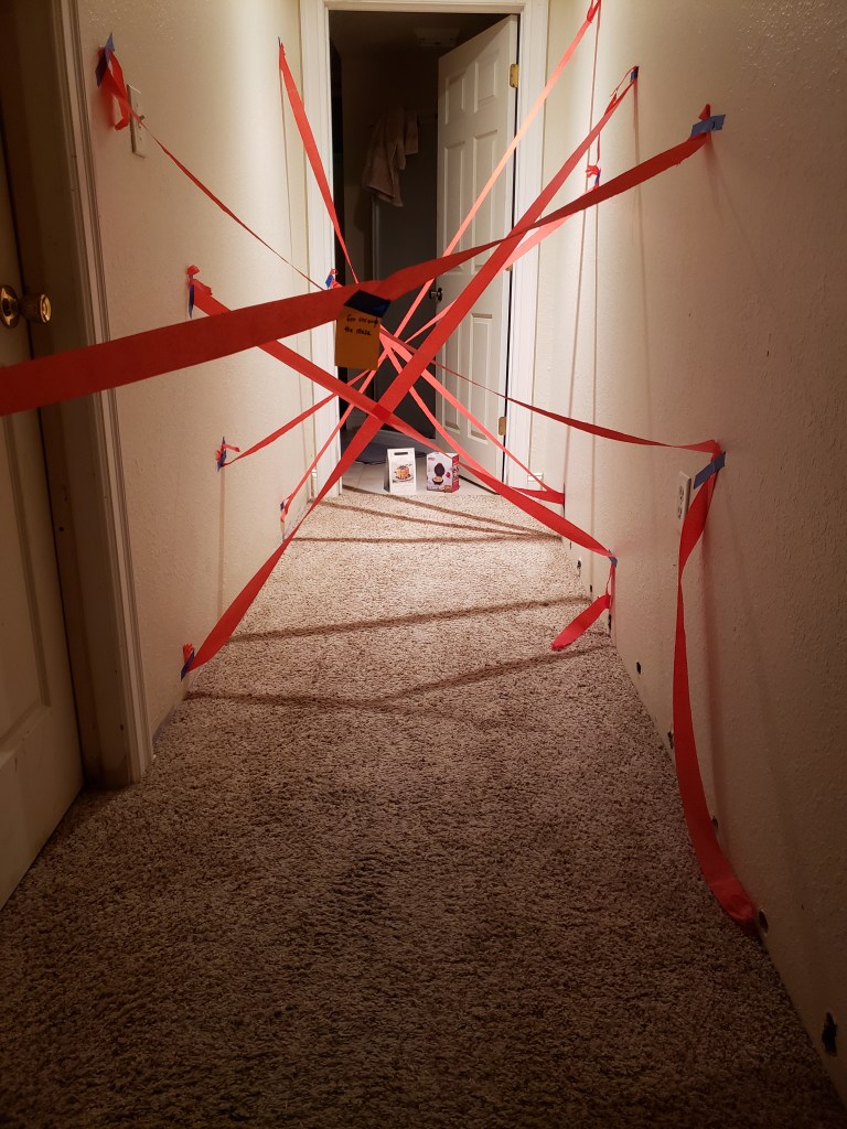 “First, I thought we could set up this obstacle course for Jake and I to do. Kind of like you did last year. Then, tomorrow night, we can make a cookie mess in the kitchen. On the 3rd, we can–.”