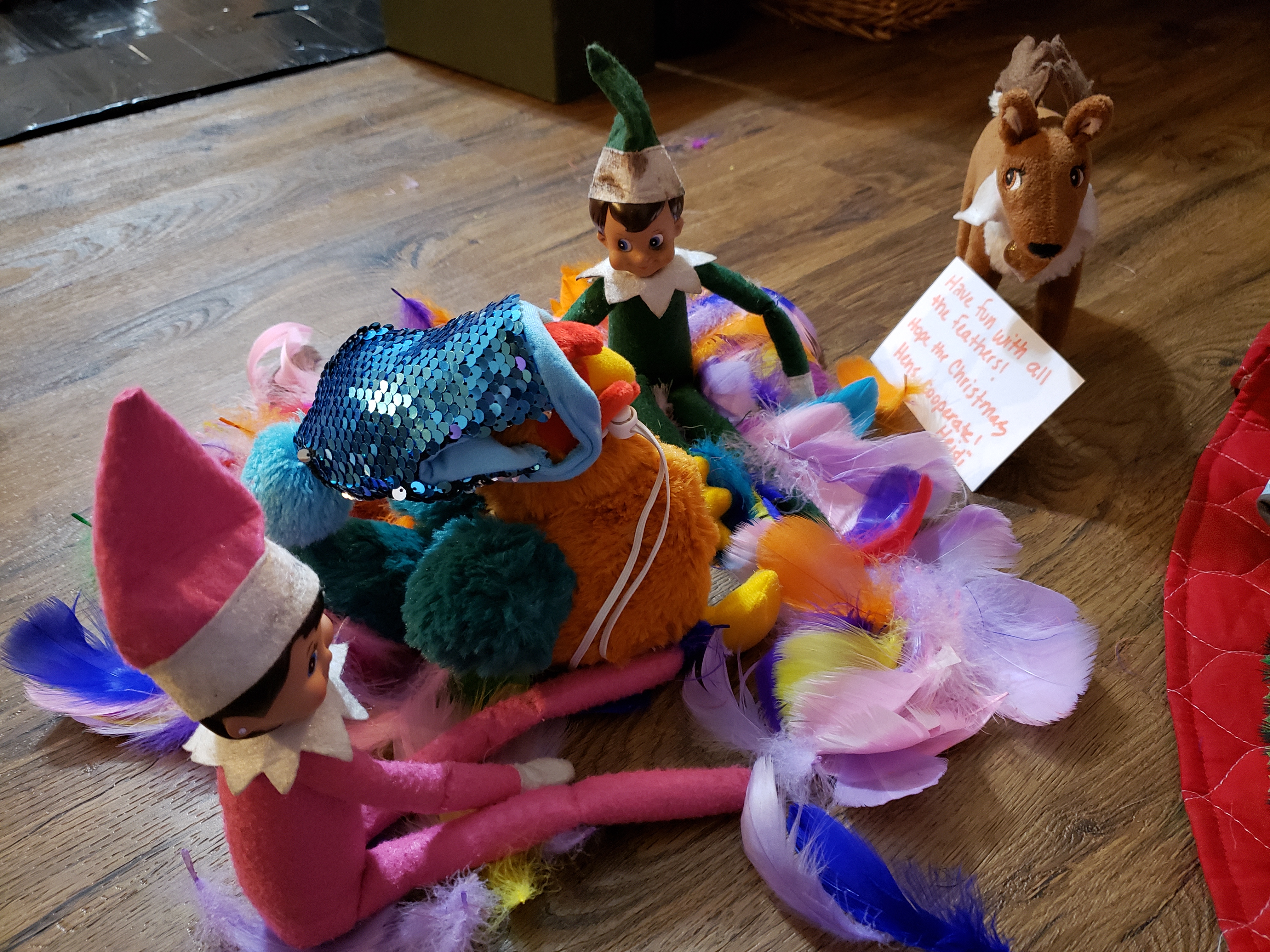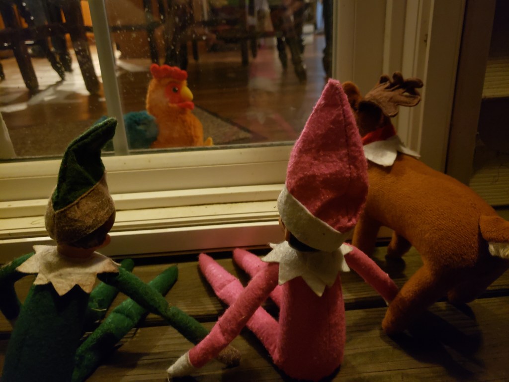 As Glitter heaved and pushed the rooster back outside, Figgy and Pixie got to work dressing the hens up like elves.