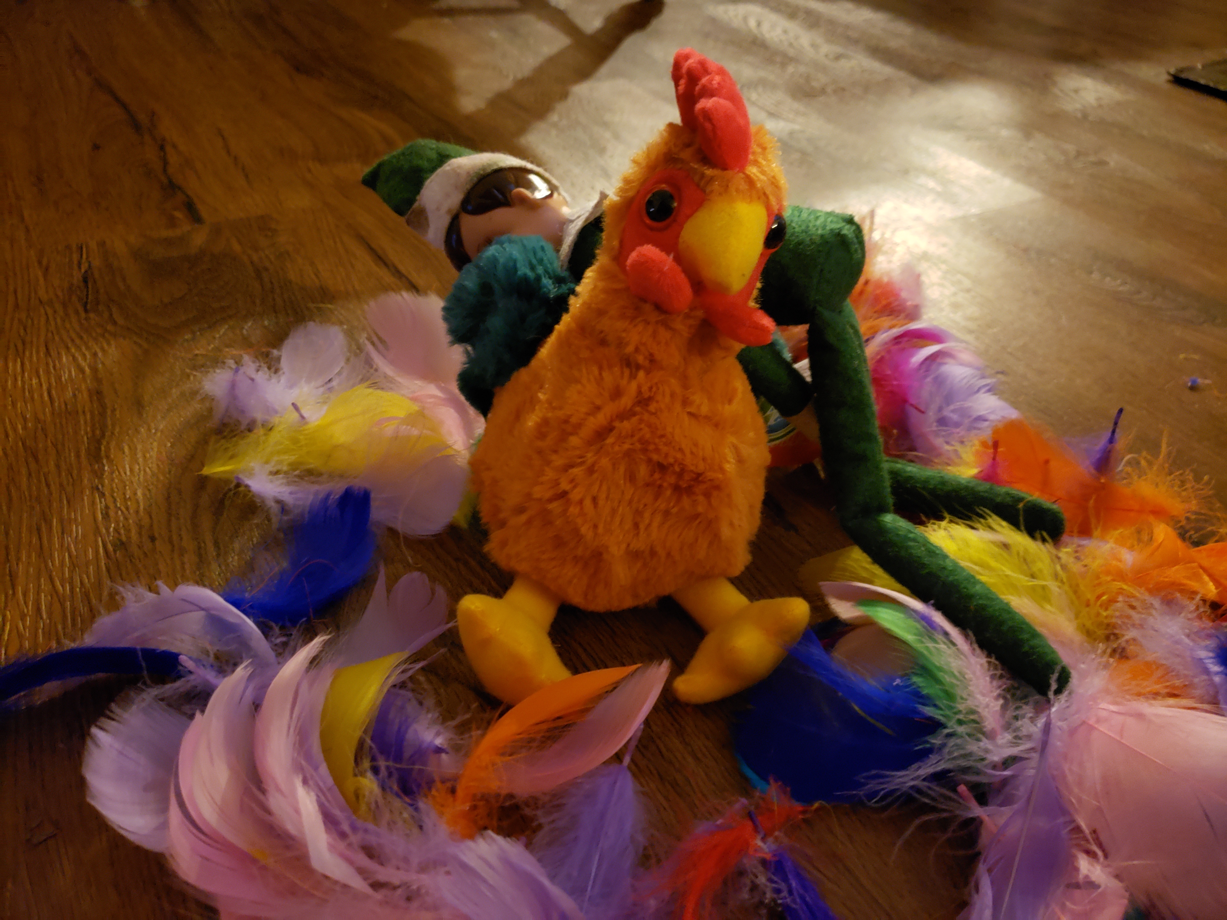 Zipping through the window the two elves landed with a crash, startling the hens and sending feathers flying.