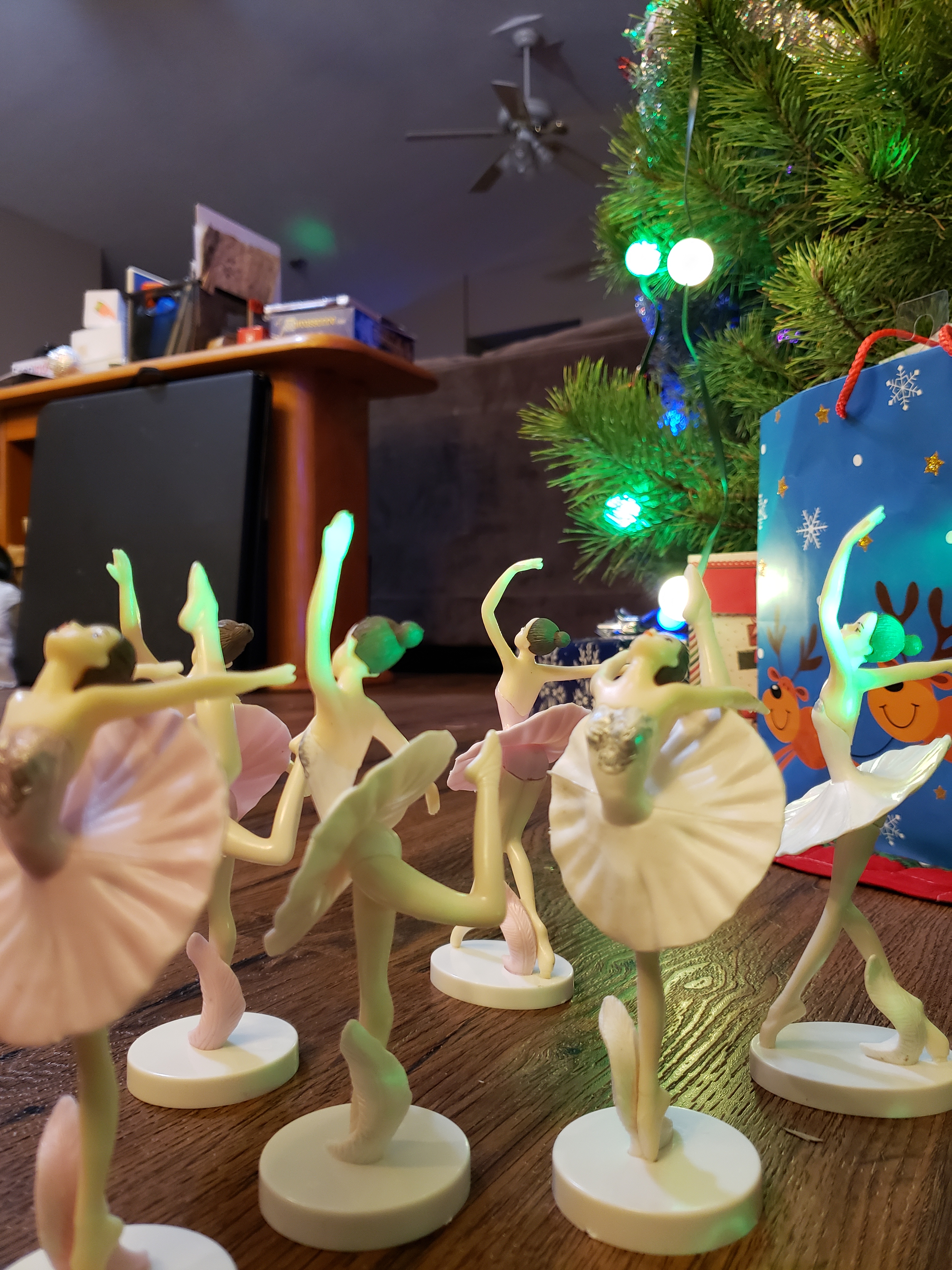 As soon as the switch was flipped, a strobe light started flashing and a disco ball started spinning. Dozens of musical ballerinas twirled on their stands. Their tinny songs clashing with each other and filling the house with everything from Greensleeves to Jingle Bells to the Nutcracker Suite.