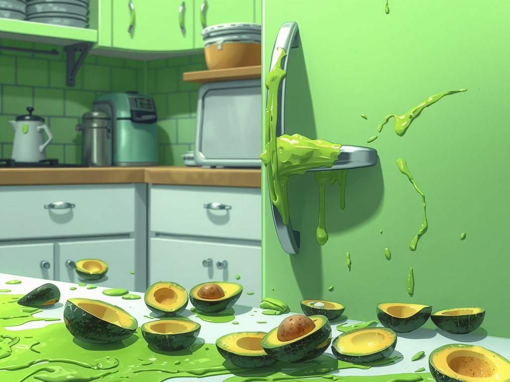 When Lil landed on the kitchen counter, everything. Every. Single. Thing. Was covered in green. Avocado peels were littered over the countertops and floors and there was a big pasty green smear on the fridge handle. The walls looked as though Mildred had redecorated with green paint.