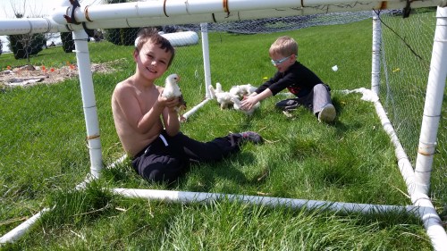 We move the chicks outside to the run every day. The boys fight over who gets to pick them up, transport them and put them in the pen.