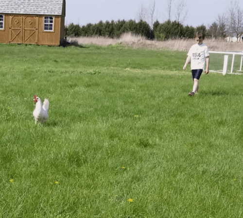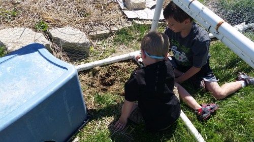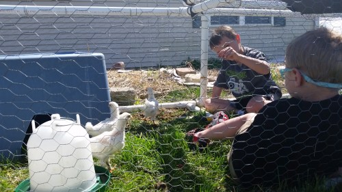 As I sat watching, I wondered at the chicks lack of fear with the boys. They hopped on their laps, walked right up to them and came running to a “hear chickie, chickie”.