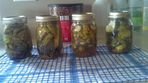 Since the pickled okra/chard was a success, I decided to try the same brine on cucumbers and green beans.